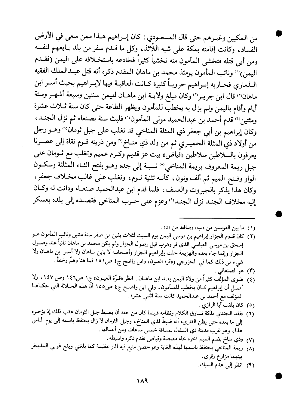 من المكيين وَغَيرهم حَتَّى قَالَ المَسْعُودِيّ كَانَ إِبْرَاهِيم هَذَا مِمَّن سعى فِي الأَرْض الْفساد وَكَانَت إِقَامَته بِمَكَّة على شبه اللائذ وكل مَا قدم سفر من بلد بايعهم لنَفسِهِ وَمن أَبى قَتله فتخشى الْمَأْمُون يَوْمئِذٍ مُحَمَّد بن ماهان الْمُقدم ذكره أَنه قتل عبد الْملك الْفَقِيه الذمارِي فحاربه إِبْرَاهِيم حروبا كَثِيرَة كَانَت الْعَاقِبَة فِيهَا لإِبْرَاهِيم بِحَيْثُ أسر ابْن ماهان قَالَ ابْن جرير وَكَانَ مبلغ ولَايَة ابْن ماهان لليمن سنتَيْن وَسَبْعَة أشهر وَسِتَّة أَيَّام وَأقَام بِالْيمن وَلم يزل بِهِ يخْطب لِلْمَأْمُونِ وَيظْهر الطَّاعَة حَتَّى كَانَ سنة ثَلَاث عشرَة ومئتين قدم أَحْمد بن عبد الحميد مولى الْمَأْمُون فَلبث سنة بِصَنْعَاء ثمَّ نزل الْجند وَكَانَ إِبْرَاهِيم بن أبي جَعْفَر ذِي الْمثلَة المناخي قد تغلب على جبل ثومان وَهُوَ رجل من أَوْلَاد ذِي الْمثلَة الْحِمْيَرِي ثمَّ من ولد ذِي مناخ وَمن ذُريَّته قوم تقاة إِلَى عصرنا يعْرفُونَ بالسلاطين سلاطين قياض بَيت عز قديم وكرم عميم وتغلب مَعَ ثومان على جبل ريمة الْمَعْرُوف بريمة المناخي نِسْبَة إِلَى جده وهوبفتح الثَّاء الْمُثَلَّثَة وَسُكُون الْوَاو وَفتح الْمِيم ثمَّ ألف وَنون كَأَنَّهُ تَثْنِيَة ثوم وتغلب على غَالب مخلاف جَعْفَر وَكَانَ هَذَا يذكر بالجبروت والعسف فَلَمَّا قدم ابْن عبد الحميد صنعاء ودانت لَهُ وَكَانَ إِلَيْهِ مخلاف الْجند نزل الْجند وعزم على حَرْب المناخي فقصده إِلَى بَلَده بعسكر