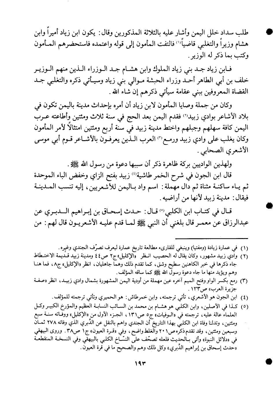 وَكَانَ من جملَة وَصَايَا الْمَأْمُون لِابْنِ زِيَاد أَن أمره بإحداث مَدِينَة بِالْيمن تكون فِي بِلَاد الأشاعر بوادي زبيد فَقدم الْيمن بعد الْحَج فِي سنة ثَلَاث ومئتين وأطاعته عرب الْيمن كَافَّة سهلهم وجبلهم واختط مَدِينَة زبيد فِي سنة أَربع ومئتين امتثالا لأمر الْمَأْمُون وَكَانَ يغلب على وَادي زبيد ورمع الْعَرَب الَّذين يعْرفُونَ بالأشاعر قوم أبي مُوسَى الْأَشْعَرِيّ الصَّحَابِيّ