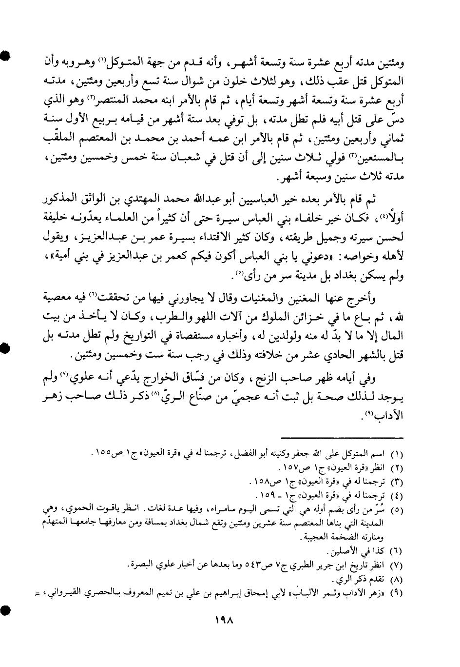 ومئتين مدَّته أَربع عشرَة سنة وَتِسْعَة أشهر وَأَنه قدم من جِهَة المتَوَكل وهروبه وَأَن المتَوَكل قتل عقب ذَلِك وَهُوَ لثلاث خلون من شَوَّال سنة تسع وَأَرْبَعين ومئتين مدَّته أَربع عشرَة سنة وَتِسْعَة أشهر وَتِسْعَة أَيَّام ثمَّ قَامَ بِالْأَمر ابْنه مُحَمَّد الْمُنْتَصر وَهُوَ الَّذِي دس على قتل أَبِيه فَلم تطل مدَّته بل توفّي بعد سِتَّة أشهر من قِيَامه بربيع الأول سنة ثَمَانِي وَأَرْبَعين ومئتين ثمَّ قَامَ بِالْأَمر ابْن عَمه أَحْمد بن مُحَمَّد بن المعتصم الملقب بالمستعين فولي ثَلَاث سِنِين إِلَى أَن قتل فِي شعْبَان سنة خمس وَخمسين ومئتين مدَّته ثَلَاث سِنِين وَسَبْعَة أشهر