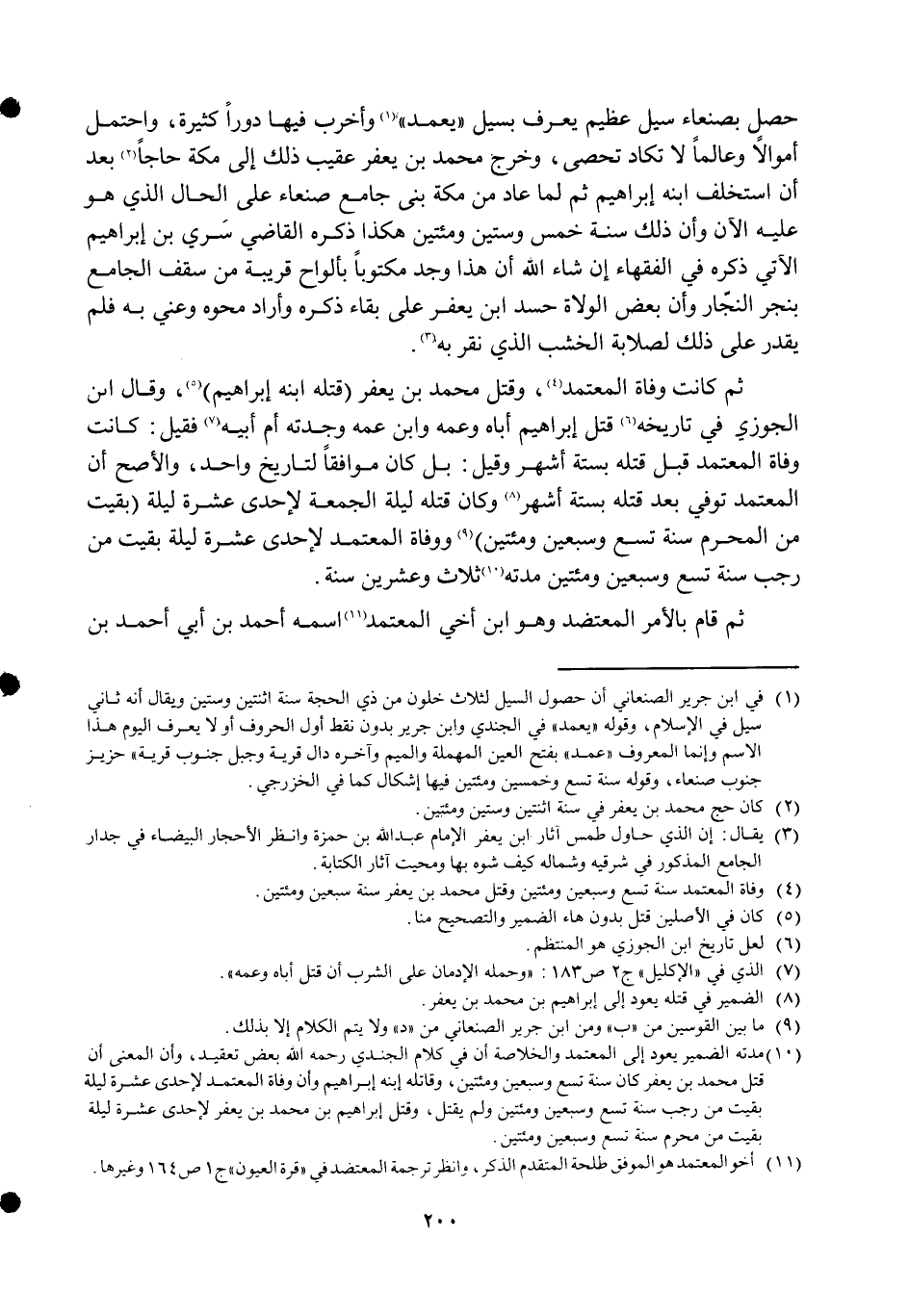 حصل بِصَنْعَاء سيل عَظِيم يعرف بسيل يعمد وأخرب فِيهَا دورا كَثِيرَة وَاحْتمل أَمْوَالًا وعالما لَا تكَاد تحصى وَخرج مُحَمَّد بن يعفر عقيب ذَلِك إِلَى مَكَّة حَاجا بعد أَن اسْتخْلف ابْنه إِبْرَاهِيم ثمَّ لما عَاد من مَكَّة بنى جَامع صنعاء على الْحَال الَّذِي هُوَ عَلَيْهِ الْآن وَأَن ذَلِك سنة خمس وَسِتِّينَ ومئتين هَكَذَا ذكره القَاضِي سري بن إِبْرَاهِيم الْآتِي ذكره فِي الْفُقَهَاء إِن شَاءَ الله أَن هَذَا وجد مَكْتُوبًا بألواح قريبَة من سقف الْجَامِع بنجر النجار وَأَن بعض الْوُلَاة حسد ابْن يعفر على بَقَاء ذكره وَأَرَادَ محوه وعني بِهِ فَلم يقدر على ذَلِك لصلابة الْخشب الَّذِي نقر بِهِ