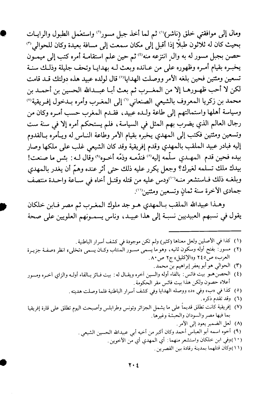 وَمَال إِلَى موافقتي خلق ناشر ثمَّ لما أَخذ جبل مسور وَاسْتعْمل الطبول والرايات بِحَيْثُ كَانَ لَهُ ثَلَاثُونَ طبلا إِذا أقبل إِلَى مَكَان سَمِعت إِلَى مَسَافَة بعيدَة وَكَانَ للحوالي حصن بجبل مسور لَهُ بِهِ وَال انتزعه مِنْهُ ثمَّ حِين علم استقامة أمره كتب إِلَى مَيْمُون يُخبرهُ بِقِيَام أمره وظهوره على من عانده وَبعث لَهُ بِهَدَايَا وتحف جليلة وَذَلِكَ سنة تسعين ومئتين فحين بلغه الْأَمر ووصلت الْهَدَايَا قَالَ لوَلَده عبيد هَذِه دولتك قد قَامَت لَكِن لَا أحب ظُهُورهَا إِلَّا من الْمغرب ثمَّ بعث أَبَا عبد الله الْحُسَيْن بن أَحْمد بن مُحَمَّد بن زَكَرِيَّا الْمَعْرُوف بالشيعي الصَّنْعَانِيّ إِلَى الْمغرب وَأمره بِدُخُول إفريقية وسياسة أَهلهَا واستمالتهم إِلَى طَاعَة وَلَده عبيد فَقدم الْمغرب حسب أمره وَكَانَ من رجال الْعَالم الَّذِي يضْرب بهم الْمثل فِي السياسة فَلم يستحكم أمره إِلَّا فِي سنة سِتّ وَتِسْعين ومئتين فَكتب إِلَى الْمهْدي يُخبرهُ بِقِيَام الْأَمر وَطَاعَة النَّاس لَهُ ويأمره بالقدوم إِلَيْهِ فبادر عبيد الملقب بالمهدي وَقدم إفريقية وَقد كَانَ الشيعي غلب على ملكهَا وَصَارَ بِيَدِهِ فحين قدم الْمهْدي سلمه إِلَيْهِ فندمه وذمه أَخُوهُ وَقَالَ لَهُ بئس مَا صنعت بِيَدِك ملك تسلمه لغيرك وَجعل يُكَرر عَلَيْهِ ذَلِك حَتَّى أثر عِنْده وهم أَن يغدر بالمهدي وبلغه ذَلِك فاستشعر مِنْهُ ودس عَلَيْهِ من قَتله وَقتل أَخَاهُ فِي سَاعَة وَاحِدَة منتصف جُمَادَى الْآخِرَة سنة ثَمَان وَتِسْعين ومئتين