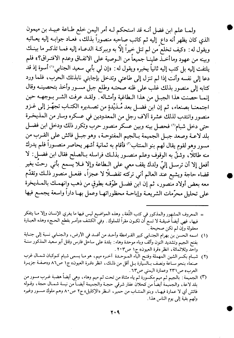 وَلَقَد عرفت الشَّرّ بِوَجْهِهِ حِين اجْتَمَعنَا بِصَنْعَاء ثمَّ إِن ابْن فضل بعد مديدة من تصديره الْكتاب تجهز إِلَى غَزْو مَنْصُور وانتدب لذَلِك عشرَة آلَاف رجل من الْمَعْدُودين فِي عسكره وَسَار من المذيخرة حَتَّى دخل شبام فَحصل بَينه وَبَين عَسْكَر مَنْصُور حَرْب وتكرر ذَلِك وَدخل ابْن فضل بلد لاعة وَصعد جبل الجميمة بِالْجِيم الْمَفْتُوحَة وَهُوَ جبل فائش على الْقرب من مسور وَهُوَ لقوم يُقَال لَهُم بَنو المنتاب فَأَقَامَ بِهِ ثَمَانِيَة أشهر يحاصر منصورا فَلم يدْرك مِنْهُ طائلا وشق بِهِ الْوُقُوف وَعلم مَنْصُور بذلك فراسله بِالصُّلْحِ فَقَالَ ابْن فضل لَا أفعل إِلَّا أَن ترسل إِلَيّ ولدك يقف معي على الطَّاعَة وَإِلَّا فَلَا يسمع بِأَنِّي رحت بِغَيْر قَضَاء حَاجَة ويشيع عِنْد الْعَالم أَنِّي تركته تفضلا لَا عَجزا فَفعل مَنْصُور ذَلِك وَتقدم مَعَه بعض أَوْلَاد مَنْصُور ثمَّ إِن ابْن فضل طوقه بطوق من ذهب وانهمك بالمذيخرة على تَحْلِيل مُحرمَات الشَّرِيعَة وَإِبَاحَة محظوراتها وَعمل بهَا دَارا وَاسِعَة يجمع فِيهَا