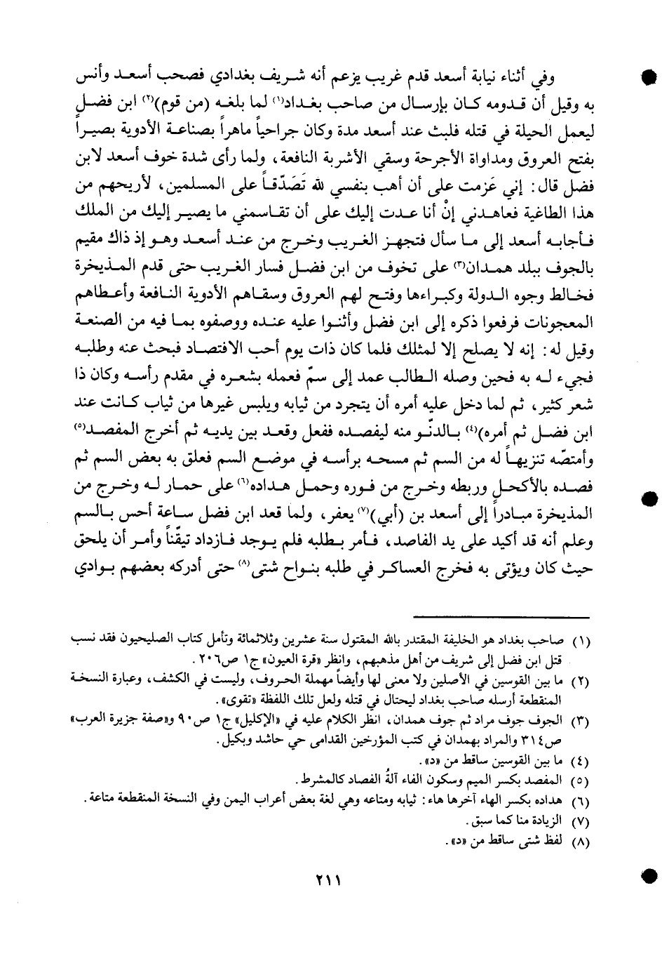 وَفِي أثْنَاء نِيَابَة أسعد قدم غَرِيب يزْعم أَنه شرِيف بغدادي فصحب أسعد وَأنس بِهِ وَقيل أَن قدومه كَانَ بإرسال من صَاحب بَغْدَاد لما بلغه من قوم ابْن فضل ليعْمَل الْحِيلَة فِي قَتله فَلبث عِنْد أسعد مُدَّة وَكَانَ جراحيا ماهرا بصناعة الْأَدْوِيَة بَصيرًا بِفَتْح الْعُرُوق ومداواة الأجرحة وَسقي الْأَشْرِبَة النافعة وَلما رأى شدَّة خوف أسعد لِابْنِ فضل قَالَ إِنِّي عزمت على أَن أهب بنفسي لله تصدقا على الْمُسلمين لأريحهم من هَذَا الطاغية فعاهدني إِن أَنا عدت إِلَيْك على أَن تقاسمني مَا يصير إِلَيْك من الْملك فَأَجَابَهُ أسعد إِلَى مَا سَأَلَ فتجهز الْغَرِيب وَخرج من عِنْد أسعد وَهُوَ إِذْ ذَاك مُقيم بالجوف بِبَلَد هَمدَان على تخوف من ابْن فضل فَسَار الْغَرِيب حَتَّى قدم المذيخرة فخالط وُجُوه الدولة وكبراءها وَفتح لَهُم الْعُرُوق وسقاهم الْأَدْوِيَة النافعة وَأَعْطَاهُمْ المعجونات فَرفعُوا ذكره إِلَى ابْن فضل وأثنوا عَلَيْهِ عِنْده ووصفوه بِمَا فِيهِ من الصَّنْعَة وَقيل لَهُ إِنَّه لَا يصلح إِلَّا لمثلك فَلَمَّا كَانَ ذَات يَوْم أحب الافتصاد فبحث عَنهُ وَطَلَبه فجيء لَهُ بِهِ فحين وَصله الطَّالِب عمد إِلَى سم فعمله بِشعرِهِ فِي مقدم رَأسه وَكَانَ ذَا شعر كثير ثمَّ لما دخل عَلَيْهِ أمره أَن يتجرد من ثِيَابه ويلبس غَيرهَا من ثِيَاب كَانَت عِنْد ابْن فضل ثمَّ أمره بالدنو مِنْهُ ليفصده فَفعل وَقعد بَين يَدَيْهِ ثمَّ أخرج المفصد وأمتصه تَنْزِيها لَهُ من السم ثمَّ مَسحه بِرَأْسِهِ فِي مَوضِع السم فعلق بِهِ بعض السم ثمَّ فصده بالأكحل وربطه وَخرج من فوره وَحمل هداده على حمَار لَهُ وَخرج من المذيخرة مبادرا إِلَى أسعد بن أبي يعفر وَلما قعد ابْن فضل سَاعَة أحس بالسم وَعلم أَنه قد أكيد على يَد الفاصد فَأمر بِطَلَبِهِ فَلم يُوجد فازداد تَيَقنا وَأمر أَن يلْحق حَيْثُ كَانَ وَيُؤْتى بِهِ فَخرج العساكر فِي طلبه بنواح شَتَّى حَتَّى أدْركهُ بَعضهم بوادي