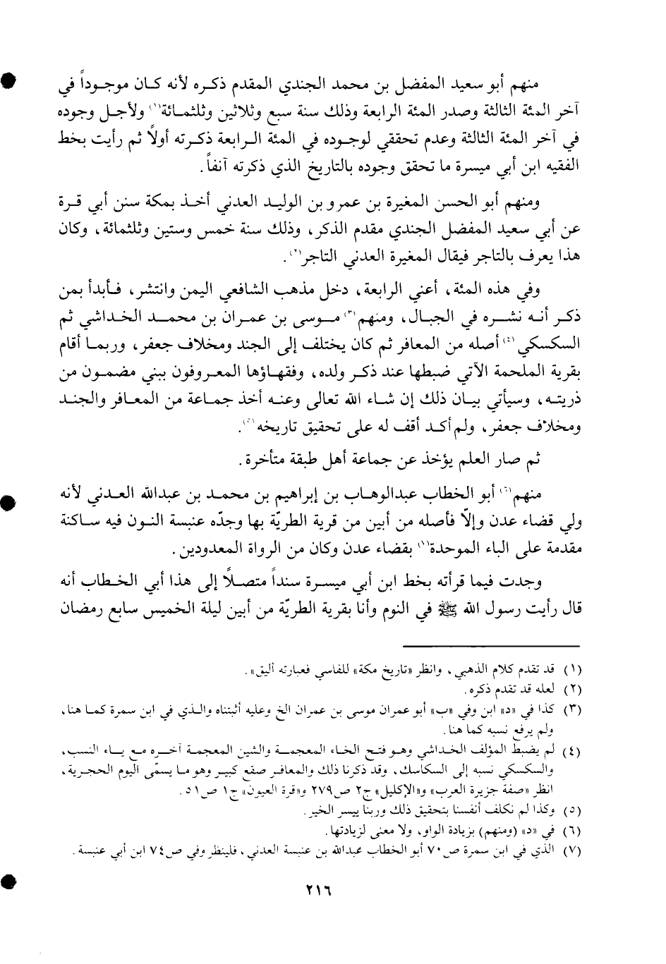 مِنْهُم أَبُو سعيد الْمفضل بن مُحَمَّد الجندي الْمُقدم ذكره لِأَنَّهُ كَانَ مَوْجُودا فِي آخرالمئة الثَّالِثَة وَصدر المئة الرَّابِعَة وَذَلِكَ سنة سبع وَثَلَاثِينَ وثلثمائة وَلأَجل وجوده فِي آخر المئة الثَّالِثَة وَعدم تحققي لوُجُوده فِي المئة الرَّابِعَة ذكرته أَولا ثمَّ رَأَيْت بِخَط الْفَقِيه ابْن أبي ميسرَة مَا تحقق وجوده بالتاريخ الَّذِي ذكرته آنِفا