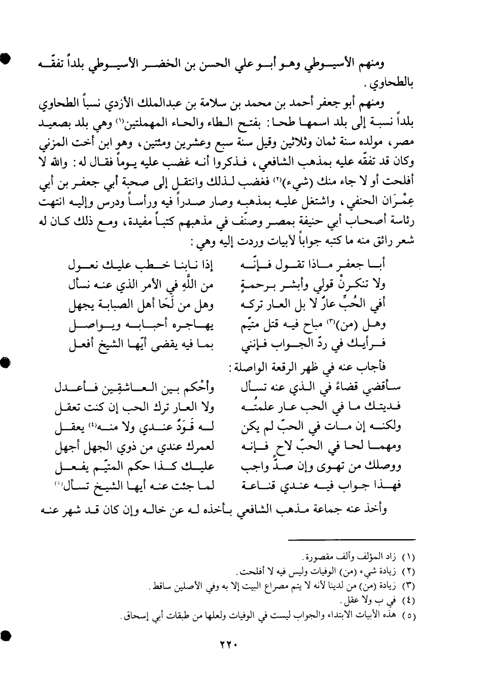 وَمِنْهُم أَبُو جَعْفَر أَحْمد بن مُحَمَّد بن سَلامَة بن عبد الْملك الْأَزْدِيّ نسبا الطَّحَاوِيّ بَلَدا نِسْبَة إِلَى بلد اسْمهَا طحا بِفَتْح الطَّاء والحاء الْمُهْمَلَتَيْنِ وَهِي بلد بصعيد مصر مولده سنة ثَمَان وَثَلَاثِينَ وَقيل سنة سبع وَعشْرين ومئتين وَهُوَ ابْن أُخْت الْمُزنِيّ وَكَانَ قد تفقه عَلَيْهِ بِمذهب الشَّافِعِي فَذكرُوا أَنه غضب عَلَيْهِ يَوْمًا فَقَالَ لَهُ وَالله لَا أفلحت أَو لَا جَاءَ مِنْك شَيْء فَغَضب لذَلِك وانتقل إِلَى صُحْبَة أبي جَعْفَر بن أبي عمرَان الْحَنَفِيّ واشتغل عَلَيْهِ بمذهبه وَصَارَ صَدرا فِيهِ ورأسا ودرس وَإِلَيْهِ انْتَهَت رئاسة أَصْحَاب أبي حنيفَة بِمصْر وصنف فِي مَذْهَبهم كتبا مفيدة وَمَعَ ذَلِك كَانَ لَهُ شعر رائق مِنْهُ مَا كتبه جَوَابا لأبيات وَردت إِلَيْهِ وَهِي ... أَبَا جَعْفَر مَاذَا تَقول فَإِنَّهُ ... إِذا نابنا خطب عَلَيْك نعول