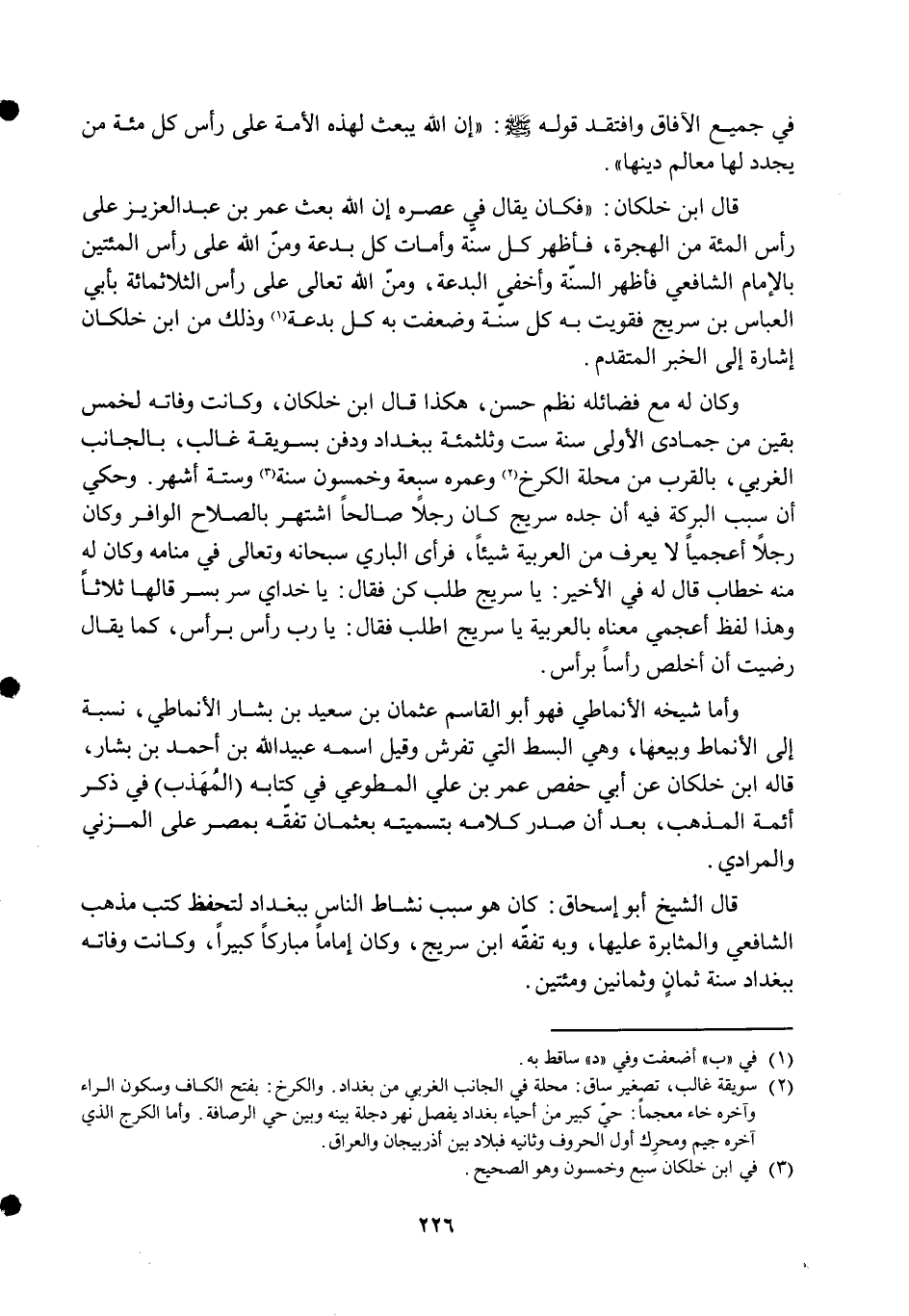 قَالَ ابْن خلكان فَكَانَ يُقَال فِي عصره إِن الله بعث عمر بن عبد الْعَزِيز على رَأس المئة من الْهِجْرَة فأظهر كل سنة وأمات كل بِدعَة وَمن الله على رَأس المئتين بِالْإِمَامِ الشَّافِعِي فأظهر السّنة وأخفى الْبِدْعَة وَمن الله تَعَالَى على رَأس الثلاثمائة بِأبي الْعَبَّاس بن سُرَيج فَقَوِيت بِهِ كل سنة وضعفت بِهِ كل بِدعَة وَذَلِكَ من ابْن خلكان إِشَارَة إِلَى الْخَبَر الْمُتَقَدّم