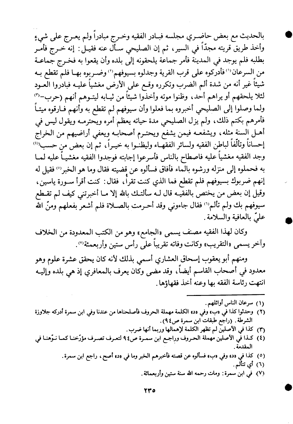 بِالْحَدِيثِ مَعَ بعض حاضري مَجْلِسه فبادر الْفَقِيه وَخرج مبادرا وَلم يعرج على شَيْء وَأخذ طَرِيق قريته مجدا فِي السّير ثمَّ إِن الصليحي سَأَلَ عَنهُ فَقيل إِنَّه خرج فَأمر بِطَلَبِهِ فَلم يُوجد فِي الْمَدِينَة فَأمر جمَاعَة يلحقونه إِلَى بَلَده وَأَن يقعوا بِهِ فَخرج جمَاعَة من السرعان فأدركوه على قرب الْقرْيَة وجدلوه بسيوفهم وضربوه بهَا فَلم تقطع بِهِ شَيْئا غير أه من شدَّة ألم الضَّرْب وتكرره وَقع على الأَرْض مغشيا عَلَيْهِ فبادروا الْعود لِئَلَّا يلحقهم أَو يراهم أحد وظنوا مَوته وَأخذُوا شَيْئا من ثِيَابه ليتوهم أَنهم حَرْب وَلما وصلوا إِلَى الصليحي أَخْبرُوهُ بِمَا فعلوا وَأَن سيوفهم لم تقطع بِهِ وَأَنَّهُمْ فارقوه مَيتا فَأَمرهمْ بكتم ذَلِك وَلم يزل الصليحي مُدَّة حَيَاته يعظم أمره ويحترمه وَيَقُول لَيْسَ فِي أهل السّنة مثله ويشفعه فِيمَن يشفع ويحترم أَصْحَابه ويعفي أراضهيم من الْخراج إحسانا وتألفا لباطن الْفَقِيه ولسائر الْفُقَهَاء وليظنوا بِهِ خيرا ثمَّ إِن بعض من حسب وجد الْفَقِيه مغشيا عَلَيْهِ فاصطاح بِالنَّاسِ فَأَسْرعُوا إجَابَته فوجدوا الْفَقِيه مغشيا عَلَيْهِ لما بِهِ فَحَمَلُوهُ إِلَى منزله ورشوه بِالْمَاءِ فأفاق فَسَأَلُوهُ عَن قَضيته فَقَالَ وَمَا هُوَ الْخَبَر فَقيل لَهُ إِنَّهُم ضربوك بسيوفهم فَلم تقطع فَمَا الَّذِي كنت تقْرَأ فَقَالَ كنت أَقرَأ سُورَة ياسين وَقيل إِن بعض من يخْتَص بالفقيه قَالَ لَهُ سَأَلتك بِاللَّه إِلَّا مَا أَخْبَرتنِي كَيفَ لم تقطع سيوفهم بك وَلم تألم فَقَالَ جَاءُونِي وَقد أَحرمت بِالصَّلَاةِ فَلم أشعر بفعلهم وَمن الله عَليّ بالعافية والسلامة