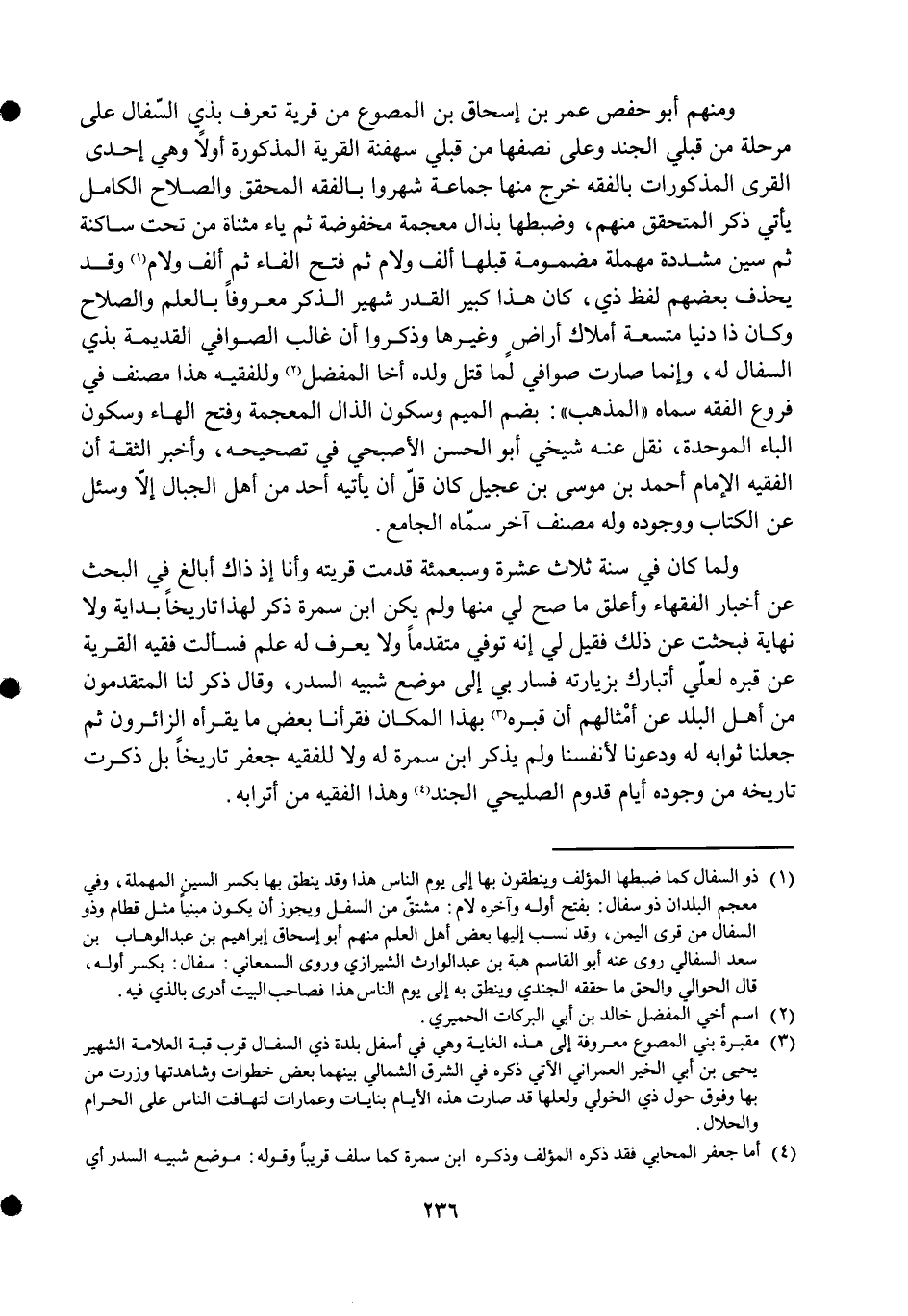 وَمِنْهُم أَبُو حَفْص عمر بن إِسْحَاق بن المصوع من قَرْيَة تعرف بِذِي السفال على مرحلة من قبلي الْجند وعَلى نصفهَا من قبلي سهفنة الْقرْيَة الْمَذْكُورَة أَولا وَهِي إِحْدَى الْقرى الْمَذْكُورَات بالفقه خرج مِنْهَا جمَاعَة شهروا بالفقه الْمُحَقق وَالصَّلَاح الْكَامِل يَأْتِي ذكر المتحقق مِنْهُم وضبطها بذال مُعْجمَة مخفوضة ثمَّ يَاء مثناة من تَحت سَاكِنة ثمَّ سين مُشَدّدَة مُهْملَة مَضْمُومَة قبلهَا ألف وَلَام ثمَّ فتح الْفَاء ثمَّ ألف وَلَام وَقد يحذف بَعضهم لفظ ذِي كَانَ هَذَا كَبِير الْقدر شهير الذّكر مَعْرُوفا بِالْعلمِ وَالصَّلَاح وَكَانَ ذَا دنيا متسعة أَمْلَاك أراض وَغَيرهَا وَذكروا أَن غَالب الصوافي الْقَدِيمَة بِذِي السفال لَهُ وَإِنَّمَا صَارَت صوافي لما قتل وَلَده أَخا الْمفضل وللفقيه هَذَا مُصَنف فِي فروع الْفِقْه سَمَّاهُ الْمَذْهَب بِضَم الْمِيم وَسُكُون الذَّال الْمُعْجَمَة وَفتح الْهَاء وَسُكُون الْبَاء الْمُوَحدَة نقل عَنهُ شَيْخي أَبُو الْحسن الأصبحي فِي تَصْحِيحه وَأخْبر الثِّقَة أَن الْفَقِيه الإِمَام أَحْمد بن مُوسَى بن عجيل كَانَ قل أَن يَأْتِيهِ أحد من أهل الْجبَال إِلَّا وَسُئِلَ عَن الْكتاب ووجوده وَله مُصَنف آخر سَمَّاهُ الْجَامِع