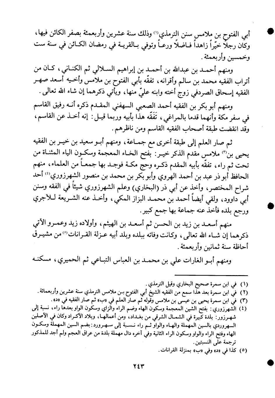 أبي الْفتُوح بن ملامس سنَن التِّرْمِذِيّ وَذَلِكَ سنة عشْرين وأربعمئة بصفر الْكَائِن فِيهَا وَكَانَ رجلا خيرا زاهدا فَاضلا ورعا وَتُوفِّي بالقرية فِي رَمَضَان الْكَائِن فِي سنة سِتّ وَخمسين وأربعمئة