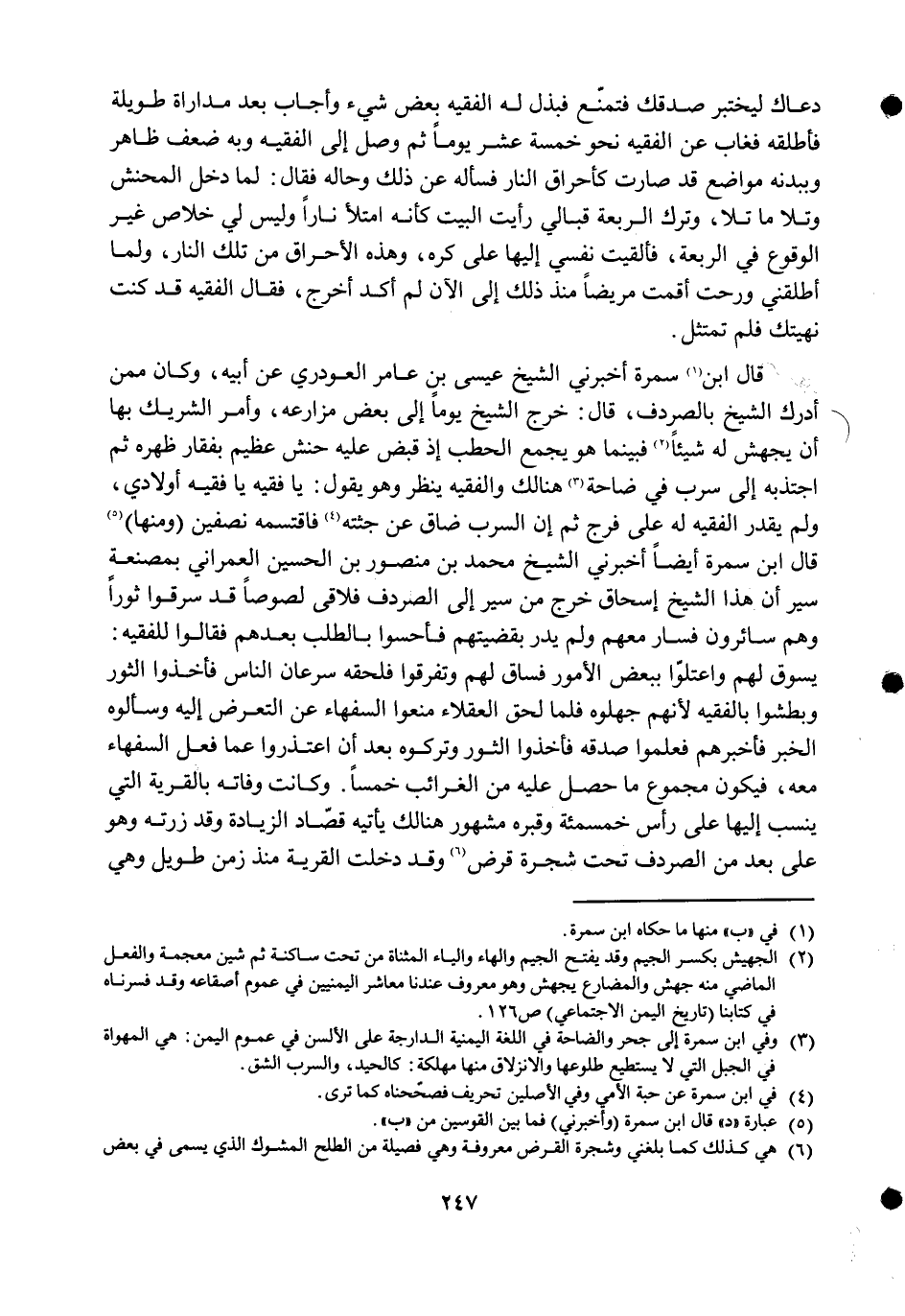 قَالَ ابْن سَمُرَة أَخْبرنِي الشَّيْخ عِيسَى بن عَامر العودري عَن أَبِيه وَكَانَ مِمَّن أدْرك الشَّيْخ بالصردف قَالَ خرج الشَّيْخ يَوْمًا إِلَى بعض مزارعه وَأمر الشَّرِيك بهَا أَن يجهش لَهُ شَيْئا فَبَيْنَمَا هُوَ يجمع الْحَطب إِذْ قبض عَلَيْهِ حَنش عَظِيم بفقار ظَهره ثمَّ اجتذبه إِلَى سرب فِي ضاحة هُنَالك والفقيه ينظر وَهُوَ يَقُول يَا فَقِيه يَا فَقِيه أَوْلَادِي وَلم يقدر الْفَقِيه لَهُ على فرج ثمَّ إِن السرب ضَاقَ عَن جثته فاقتسمه نِصْفَيْنِ وَمِنْهَا قَالَ ابْن سَمُرَة أَيْضا أَخْبرنِي الشَّيْخ مُحَمَّد بن مَنْصُور بن الْحُسَيْن العمراني بمصنعة سير أَن هَذَا الشَّيْخ إِسْحَاق خرج من سير إِلَى الصردف فلاقى لصوصا قد سرقوا ثورا وهم سائرون فَسَار مَعَهم وَلم يدر بقضيتهم فأحسوا بِالطَّلَبِ بعدهمْ فَقَالُوا للفقيه يَسُوق لَهُم وَاعْتَلُّوا بِبَعْض الْأُمُور فساق لَهُم وَتَفَرَّقُوا فَلحقه سرعَان النَّاس فَأخذُوا الثور وبطشوا بالفقيه لأَنهم جهلوه فَلَمَّا لحق الْعُقَلَاء منعُوا السُّفَهَاء عَن التَّعَرُّض إِلَيْهِ وسألوه الْخَبَر فَأخْبرهُم فَعَلمُوا صدقه فَأخذُوا الثور وتركوه بعد أَن اعتذروا عَمَّا فعل السُّفَهَاء مَعَه فَيكون مَجْمُوع مَا حصل عَلَيْهِ من الغرائب خمْسا