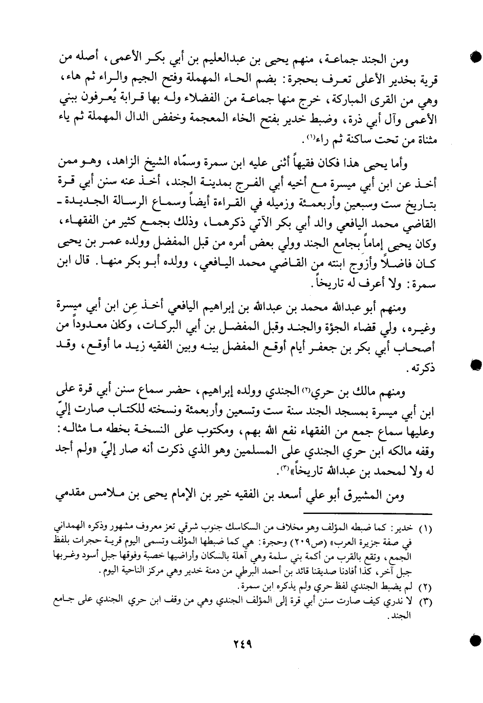 وَأما يحيى هَذَا فَكَانَ فَقِيها أثنى عَلَيْهِ ابْن سَمُرَة وَسَماهُ الشَّيْخ الزَّاهِد وَهُوَ مِمَّن أَخذ عَن ابْن أبي ميسرَة مَعَ أَخِيه أبي الْفرج بِمَدِينَة الْجند أَخذ عَنهُ سنَن أبي قُرَّة بتاريخ سِتّ وَسبعين وأربعمئة وزميله فِي الْقِرَاءَة أَيْضا وَسَمَاع الرسَالَة الجديدة القَاضِي مُحَمَّد اليافعي وَالِد أبي بكر الْآتِي ذكرهمَا وَذَلِكَ بِجمع كثير من الْفُقَهَاء وَكَانَ يحيى إِمَامًا بِجَامِع الْجند وَولي بعض أمره من قبل الْمفضل وَولده عمر بن يحيى كَانَ فَاضلا وأزوج ابْنَته من القَاضِي مُحَمَّد اليافعي وَولده أَبُو بكر مِنْهَا