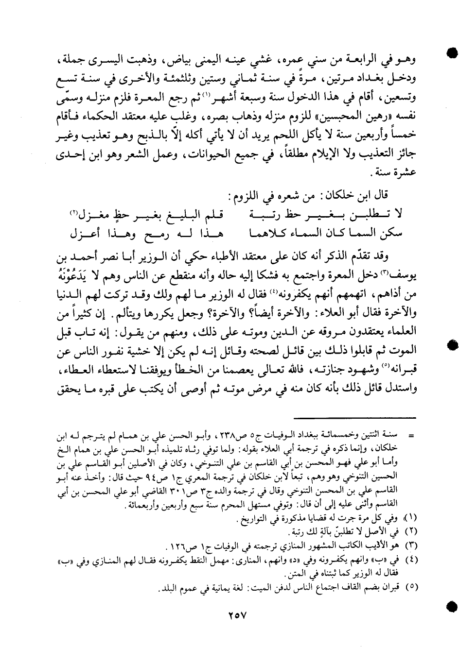 سكن السما كَانَ السَّمَاء كِلَاهُمَا ... هَذَا لَهُ رمح وَهَذَا أعزل ... وَقد تقدم الذّكر أَنه كَانَ على مُعْتَقد الْأَطِبَّاء حُكيَ أَن الْوَزير أَبَا نصر أَحْمد بن يُوسُف دخل المعرة وَاجْتمعَ بِهِ فَشَكا إِلَيْهِ حَاله وَأَنه مُنْقَطع عَن النَّاس وهم لَا يَدعُونَهُ من أذاهم اتهمهم أَنهم يكفرونه فَقَالَ لَهُ الْوَزير مَا لَهُم وَلَك وَقد تركت لَهُم الدُّنْيَا والاخرة فَقَالَ أَبُو الْعَلَاء وَالْآخِرَة أَيْضا وَالْآخِرَة وَجعل يكررها ويتألم