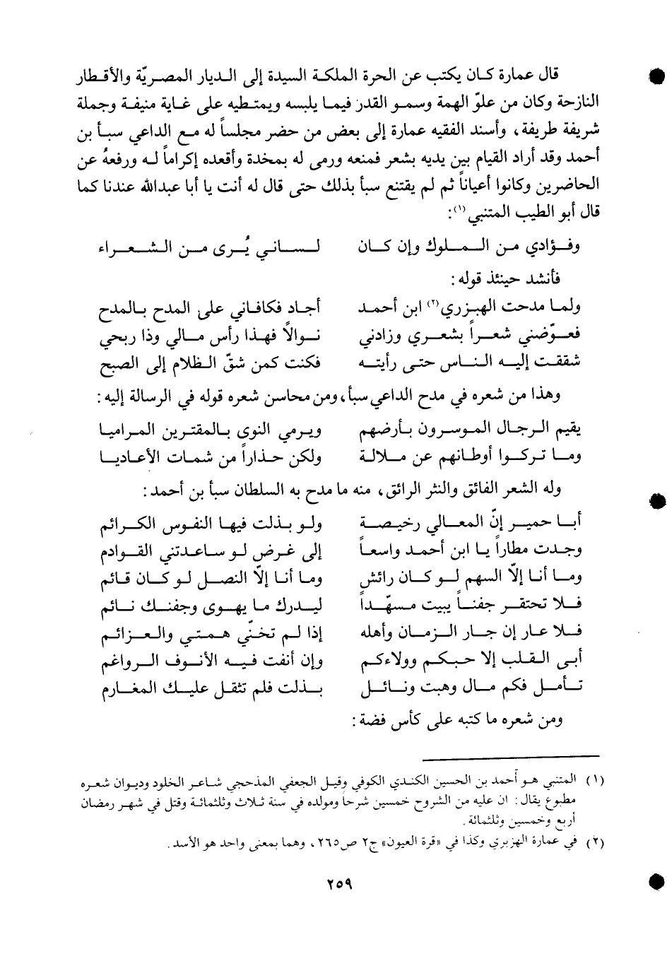 قَالَ عمَارَة كَانَ يكْتب عَن الْحرَّة الملكة السيدة إِلَى الديار المصرية والأقطار النازحة وَكَانَ من علو الهمة وسمو الْقدر فِيمَا يلْبسهُ ويمتطيه على غَايَة منفية وَجُمْلَة شريفة طريفة وَأسْندَ الْفَقِيه عمَارَة إِلَى بعض من حضر مَجْلِسا لَهُ مَعَ الدَّاعِي سبأ بن أَحْمد وَقد أَرَادَ الْقيام بَين يَدَيْهِ بِشعر فَمَنعه وَرمى لَهُ بمخدة وَأَقْعَدَهُ إِكْرَاما لَهُ وَرَفعه عَن الْحَاضِرين وَكَانُوا أعيانا ثمَّ لم يقتنع سبأ بذلك حَتَّى قَالَ لَهُ أَنْت يَا أَبَا عبد الله عندنَا كَمَا قَالَ أَبُو الطّيب المتنبي ... وفؤادي من الْمُلُوك وَإِن كَانَ ... لساني يرى من الشُّعَرَاء ... فَأَنْشد حِينَئِذٍ قَوْله ... وَلما مدحت الهبزري ابْن أَحْمد ... أَجَاد فكافاني على الْمَدْح بالمدح