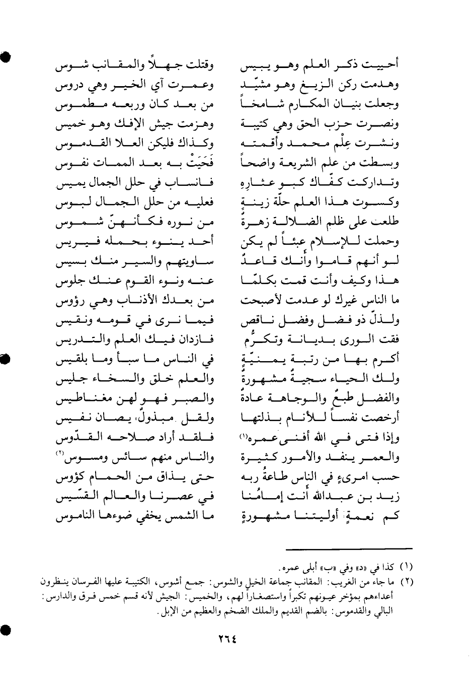 .. أَحييت ذكر الْعلم وَهُوَ يبيس ... وَقتلت جهلا والمقانب شوس