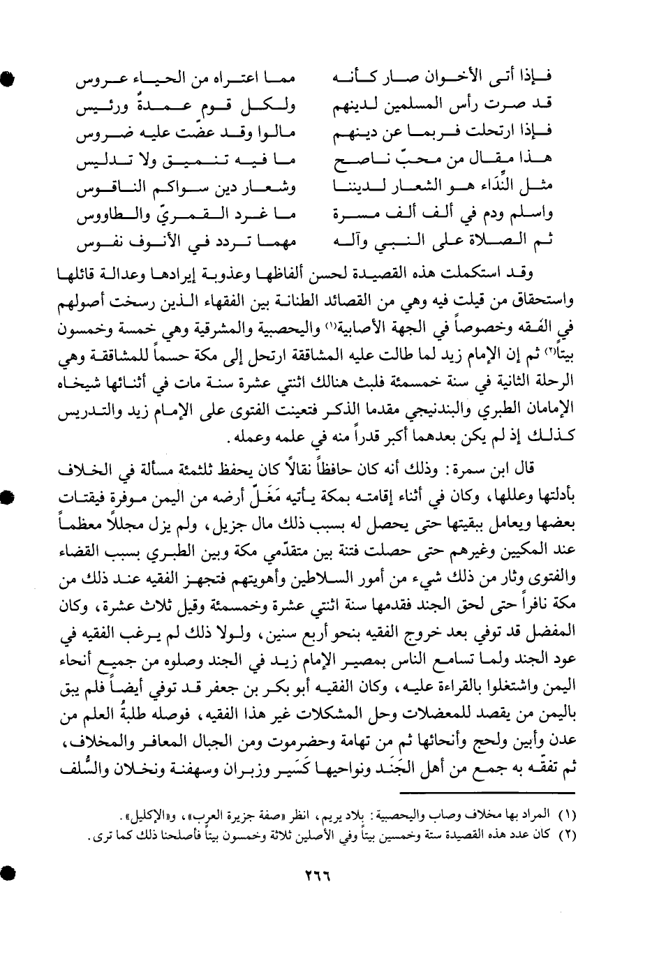 ثمَّ الصَّلَاة على النَّبِي وَآله ... مهما تردد فِي الأنوف نفوس ... وَقد استكملت هَذِه القصيدة لحسن ألفاظها وعذوبة إيرادها وعدالة قَائِلهَا وَاسْتِحْقَاق من قيلت فِيهِ وَهِي من القصائد الطنانة بَين الْفُقَهَاء الَّذين رسخت أصولهم فِي الْفِقْه وخصوصا فِي الْجِهَة الأصابية واليحصبية والمشرقية وَهِي خَمْسَة وَخَمْسُونَ بَيْتا ثمَّ إِن الإِمَام زيد لما طَالَتْ عَلَيْهِ المشاققة ارتحل إِلَى مَكَّة حسما للمشاققة وَهِي الرحلة الثَّانِيَة فِي سنة خمسمئة فَلبث هُنَالك اثْنَتَيْ عشرَة سنة مَاتَ فِي أَثْنَائِهَا شيخاه الإمامان الطَّبَرِيّ والبندنيجي مقدما الذّكر فتعينت الْفَتْوَى على الإِمَام زيد والتدريس كَذَلِك إِذْ لم يكن بعدهمَا أكبر قدرا مِنْهُ فِي علمه وَعَمله