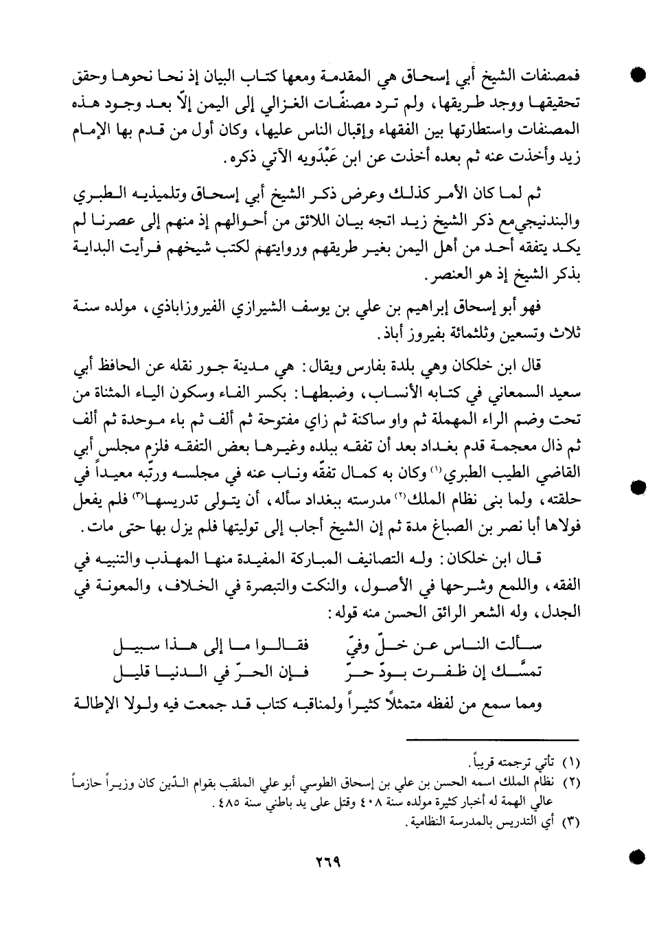فَهُوَ أَبُو إِسْحَاق إِبْرَاهِيم بن عَليّ بن يُوسُف الشِّيرَازِيّ الفيروزاباذي مولده سنة ثَلَاث وَتِسْعين وثلثمائة بفيروزأباد