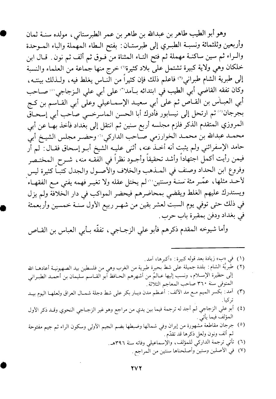 قَالَ ابْن خلكان وَهِي ولَايَة كَبِيرَة تشْتَمل على بِلَاد كَثِيرَة خرج مِنْهَا جمَاعَة من الْعلمَاء وَالنِّسْبَة إِلَى طبرية الشَّام طبراني فَاعْلَم ذَلِك فَإِن كثيرا من النَّاس يغلط فِيهِ وَلذَلِك بَينته وَكَانَ تفقه القَاضِي أبي الطّيب فِي ابْتِدَائه بآمد على أبي عَليّ الزجاجي صَاحب أبي الْعَبَّاس بن الْقَاص ثمَّ على أبي سعيد الْإِسْمَاعِيلِيّ وعَلى أبي الْقَاسِم بن كج بجرجان ثمَّ ارتحل إِلَى نيسابور فَأدْرك أَبَا الْحسن الماسرخسي صَاحب أبي إِسْحَاق الْمروزِي الْمُتَقَدّم الذّكر فَلَزِمَ مَجْلِسه أَربع سِنِين ثمَّ انْتقل إِلَى بَغْدَاد فَأخذ بهَا عَن أبي مُحَمَّد عبد الله بن مُحَمَّد الْخَوَارِزْمِيّ صَاحب الداركي وَحضر مجْلِس الشَّيْخ أبي حَامِد الإسفرائيني وَلم يثبت أَنه أَخذ عَنهُ أثنى عَلَيْهِ الشَّيْخ أَبُو إِسْحَاق فَقَالَ لم أر فِيمَن رَأَيْت أكمل اجْتِهَادًا وَأَشد تَحْقِيقا وأجود نظرا فِي الْفِقْه مِنْهُ شرح الْمُخْتَصر وفروع ابْن الْحداد وصنف فِي الْمَذْهَب وَالْخلاف وَالْأُصُول والجدل كتبا كَثِيرَة لَيْسَ لأحد مثلهَا عمر مئة سنة وسنتين لم يخْتل عقله وَلَا تغير فهمه يُفْتِي مَعَ الْفُقَهَاء ويستدرك عَلَيْهِم الْغَلَط وَيَقْضِي بمحاضرهم فيحضر المواكب فِي دَار الْخلَافَة وَلم يزل فِي ذَلِك حَتَّى توفّي يَوْم السبت لعشر بَقينَ من شهر ربيع الأول سنة خمسين وأربعمئة فِي بَغْدَاد وَدفن بمقبرة بَاب حَرْب