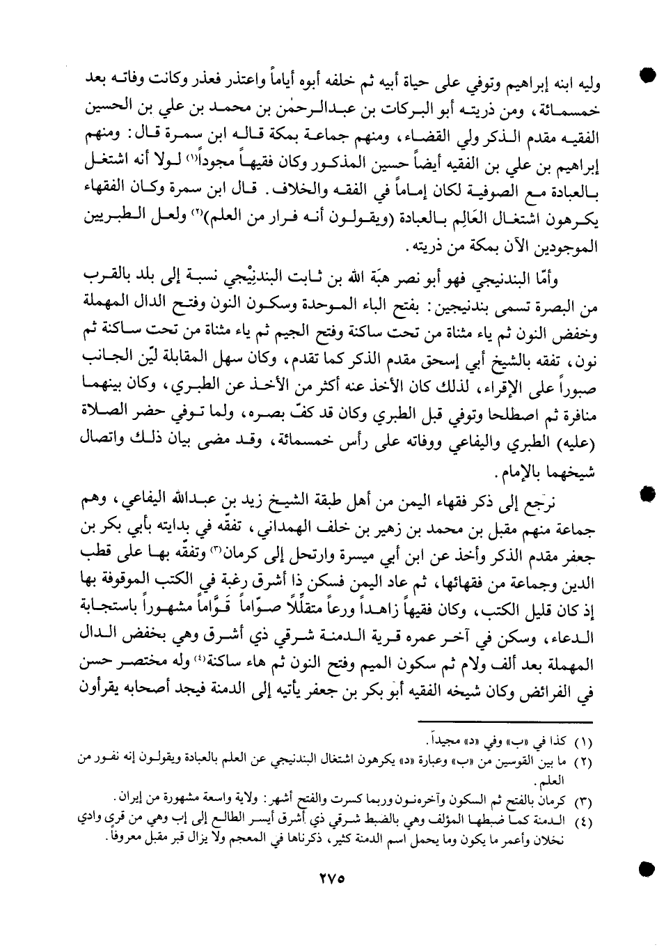 وَأما الْبَنْدَنِيجِيّ فَهُوَ أَبُو نصر هبة الله بن ثَابت الْبَنْدَنِيجِيّ نِسْبَة إِلَى بلد بِالْقربِ من الْبَصْرَة تسمى بندنيجين بِفَتْح الْبَاء الْمُوَحدَة وَسُكُون النُّون وَفتح الدَّال الْمُهْملَة وخفض النُّون ثمَّ يَاء مثناة من تَحت سَاكِنة وَفتح الْجِيم ثمَّ يَاء مثناة من تَحت سَاكِنة ثمَّ نون تفقه بالشيخ أبي إِسْحَق مقدم الذّكر كَمَا تقدم وَكَانَ سهل الْمُقَابلَة لين الْجَانِب صبورا على الإقراء لذَلِك كَانَ الْأَخْذ عَنهُ أَكثر من الْأَخْذ عَن الطَّبَرِيّ وَكَانَ بَينهمَا منافرة ثمَّ اصطلحا وَتُوفِّي قبل الطَّبَرِيّ وَكَانَ قد كف بَصَره وَلما توفّي حضر الصَّلَاة عَلَيْهِ الطَّبَرِيّ واليفاعي ووفاته على رَأس خَمْسمِائَة وَقد مضى بَيَان ذَلِك واتصال شيخهما بِالْإِمَامِ