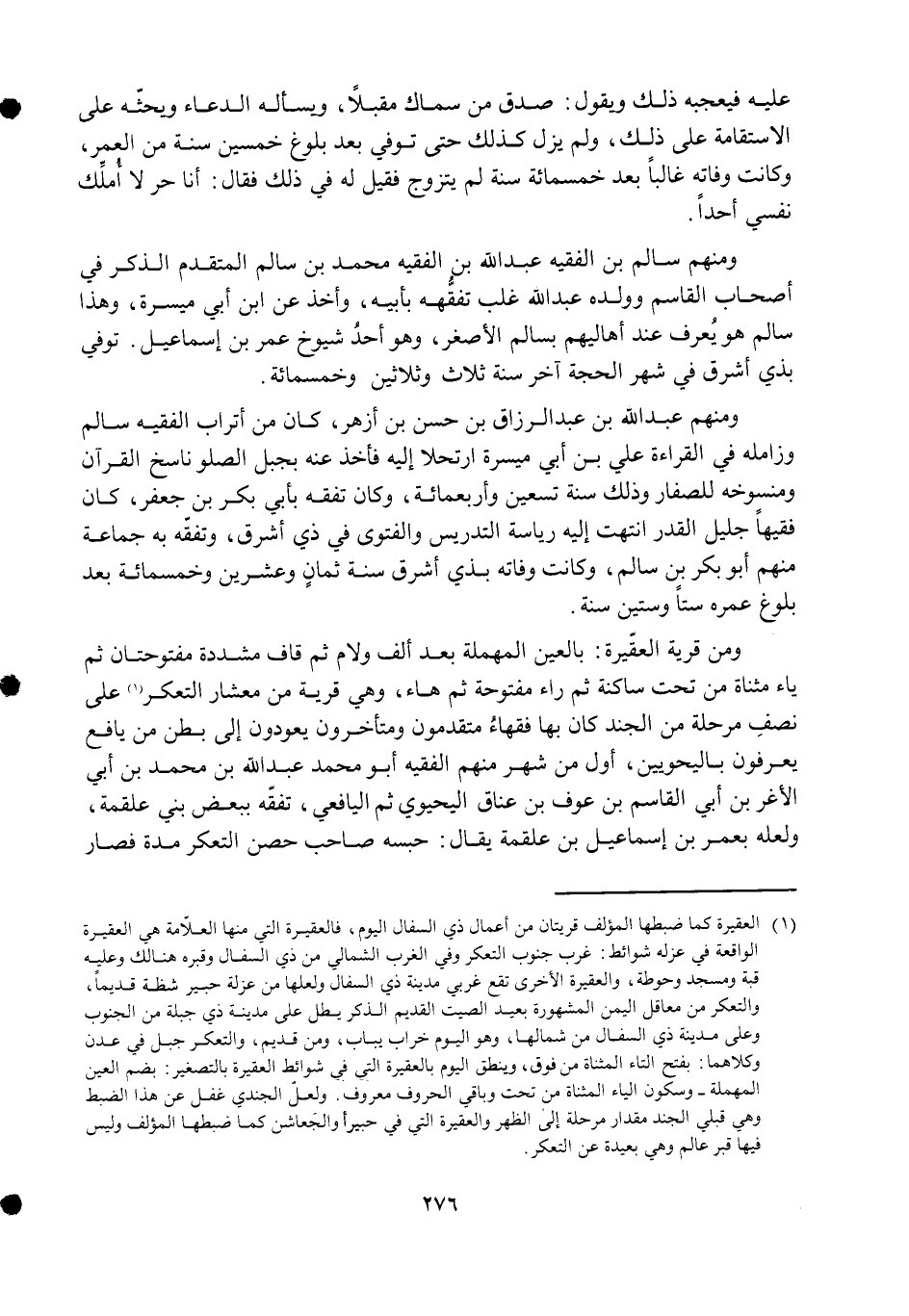 وَمن قَرْيَة العقيرة بِالْعينِ الْمُهْملَة بعد ألف وَلَام ثمَّ قَاف مُشَدّدَة مفتوحتان ثمَّ يَاء مثناة من تَحت سَاكِنة ثمَّ رَاء مَفْتُوحَة ثمَّ هَاء وَهِي قَرْيَة من معشار التعكر على نصف مرحلة من الْجند كَانَ بهَا فُقَهَاء متقدمون ومتأخرون يعودون إِلَى بطن من يافع يعْرفُونَ باليحويين أول من شهر مِنْهُم الْفَقِيه أَبُو مُحَمَّد عبد الله بن مُحَمَّد بن أبي الْأَغَر بن أبي الْقَاسِم بن عَوْف بن عنَاق اليحيوي ثمَّ اليافعي تفقه بِبَعْض بني عَلْقَمَة وَلَعَلَّه بعمر بن إِسْمَاعِيل بن عَلْقَمَة يُقَال حَبسه صَاحب حصن التعكر مُدَّة فَصَارَ