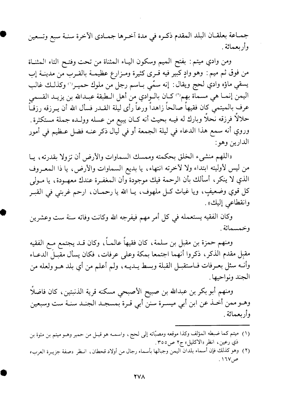 وَمن وَادي ميتم بِفَتْح الْمِيم وَسُكُون الْيَاء الْمُثَنَّاة من تَحت وَفتح التَّاء الْمُثَنَّاة من فَوق ثمَّ مِيم وَهُوَ وَاد كَبِير فِيهِ قرى كَثِيرَة ومزارع عَظِيمَة بِالْقربِ من مَدِينَة إب يسْقِي مَاؤُهُ وَادي لحج وَيُقَال إِنَّه سمي باسم رجل من مُلُوك حمير وَكَذَلِكَ غَالب الْيمن إِنَّمَا هِيَ مُسَمَّاة بهم كَانَ بالوادي من أهل الطَّبَقَة عبد الله بن يزِيد القسمي عرف بالميتمي كَانَ فَقِيها صَالحا زاهدا ورعا رأى لَيْلَة الْقدر فَسَأَلَ الله أَن يرزقه رزقا حَلَالا فرزقه نحلا وَبَارك فِيهِ بِحَيْثُ أَنه كَانَ يَبِيع من عسله وَولده جملَة مستكثرة