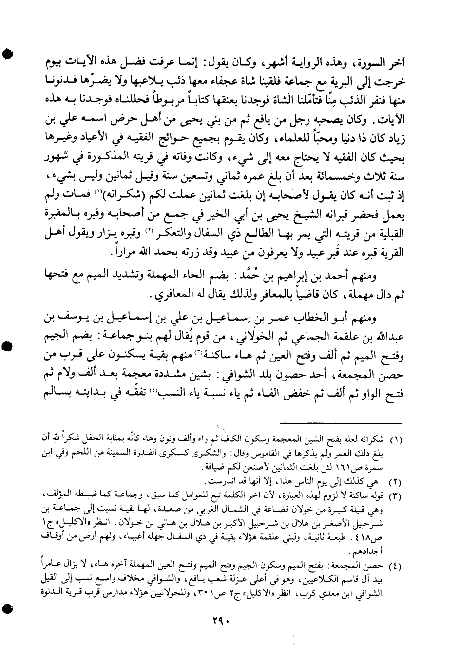 وَمِنْهُم أَبُو الْخطاب عمر بن إِسْمَاعِيل بن عَليّ بن إِسْمَاعِيل بن يُوسُف بن عبد الله بن عَلْقَمَة الجماعي ثمَّ الْخَولَانِيّ من قوم يُقَال لَهُم بَنو جمَاعَة بِضَم الْجِيم وَفتح الْمِيم ثمَّ ألف وَفتح الْعين ثمَّ هَاء سَاكِنة مِنْهُم بَقِيَّة يسكنون على قرب من حصن المجمعة أحد حصون بلد الشوافي بشين مُشَدّدَة مُعْجمَة بعد ألف وَلَام ثمَّ فتح الْوَاو ثمَّ ألف ثمَّ خفض الْفَاء ثمَّ يَاء نِسْبَة يَاء النّسَب تفقه فِي بدايته بسالم