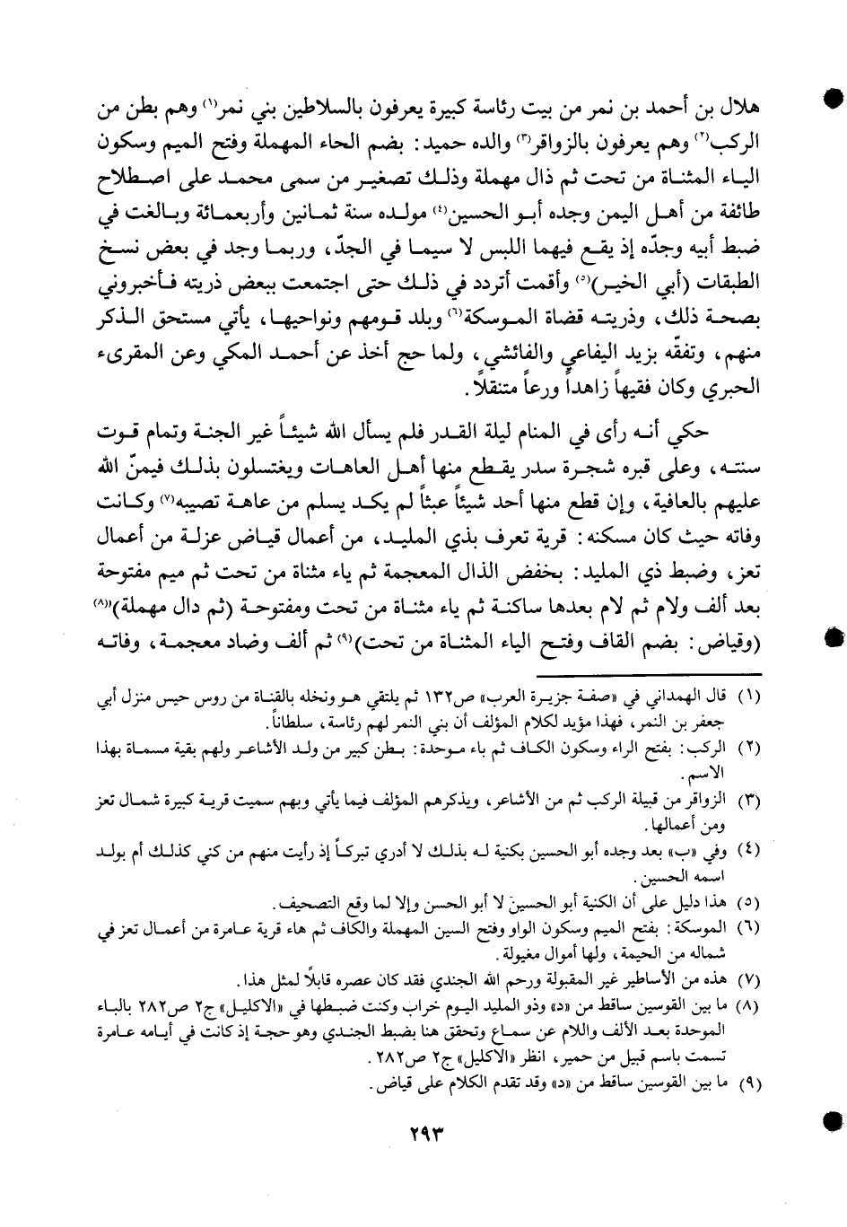 هِلَال بن أَحْمد بن نمر من بَيت رئاسة كَبِيرَة يعْرفُونَ بالسلاطين بني نمر وهم بطن من الركب وهم يعْرفُونَ بالزواقر وَالِده حميد بِضَم الْحَاء الْمُهْملَة وَفتح الْمِيم وَسُكُون الْيَاء الْمُثَنَّاة من تَحت ثمَّ ذال مُهْملَة وَذَلِكَ تَصْغِير من سمى مُحَمَّد على اصْطِلَاح طَائِفَة من أهل الْيمن وجده أَبُو الْحُسَيْن مولده سنة ثَمَانِينَ وَأَرْبَعمِائَة وبالغت فِي ضبط أَبِيه وجده إِذْ يَقع فيهمَا اللّبْس لَا سِيمَا فِي الْجد وَرُبمَا وجد فِي بعض نسخ الطَّبَقَات أبي الْخَيْر وأقمت أتردد فِي ذَلِك حَتَّى اجْتمعت بِبَعْض ذُريَّته فَأَخْبرُونِي بِصِحَّة ذَلِك وَذريته قُضَاة الموسكة وبلد قَومهمْ ونواحيها يَأْتِي مُسْتَحقّ الذّكر مِنْهُم وتفقه بزيد اليفاعي والفائشي وَلما حج أَخذ عَن أَحْمد الْمَكِّيّ وَعَن المقرىء الْحبرِي وَكَانَ فَقِيها زاهدا ورعا متنقلا