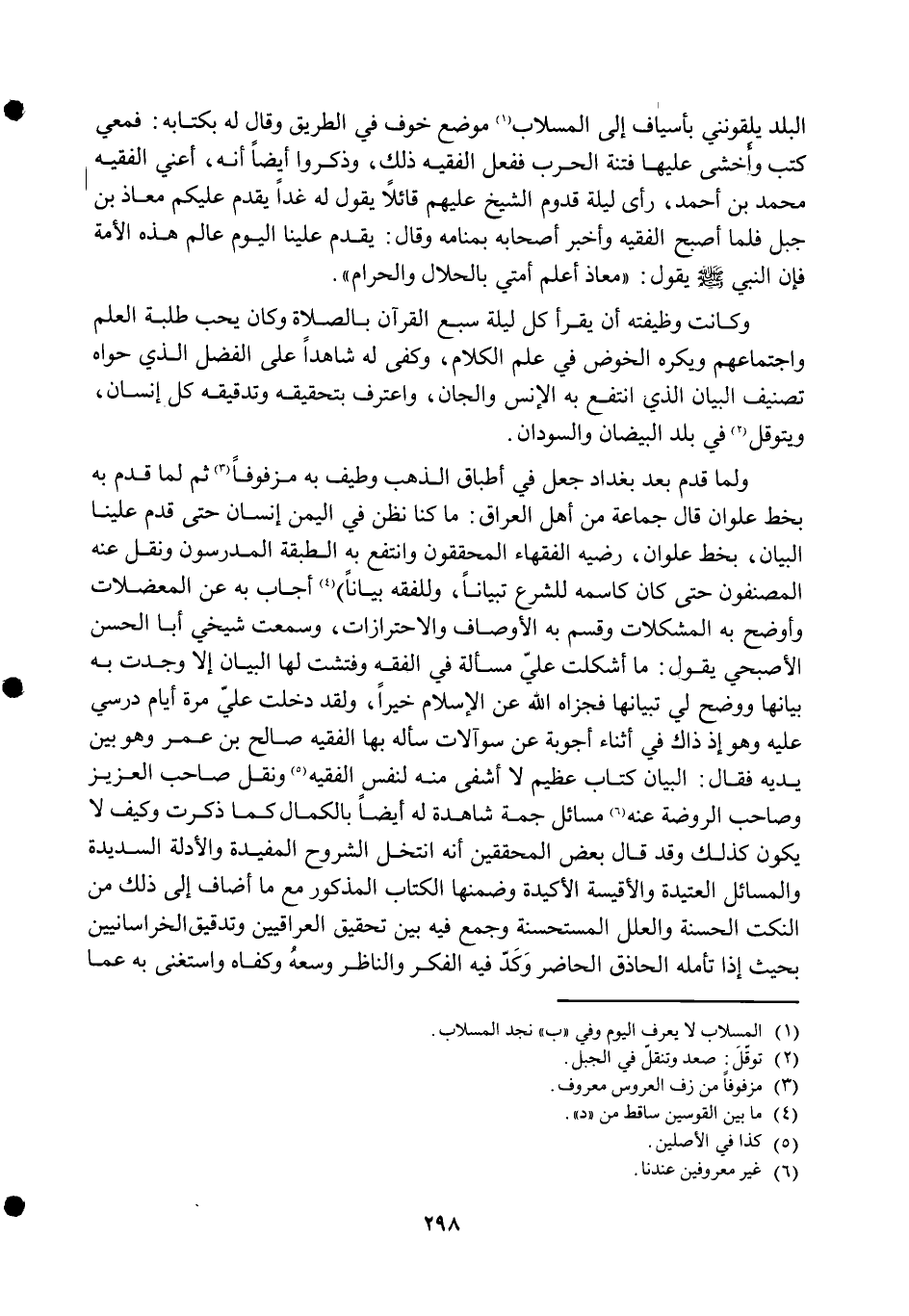 الْبَلَد يلقونني بأسياف إِلَى المسلاب مَوضِع خوف فِي الطَّرِيق وَقَالَ لَهُ بكتابه فمعي كتب وأخشى عَلَيْهَا فتْنَة الْحَرْب فَفعل الْفَقِيه ذَلِك وَذكروا أَيْضا أَنه أَعنِي الْفَقِيه مُحَمَّد بن أَحْمد رأى لَيْلَة قدوم الشَّيْخ عَلَيْهِم قَائِلا يَقُول لَهُ غَدا يقدم عَلَيْكُم معَاذ بن جبل فَلَمَّا أصبح الْفَقِيه وَأخْبر أَصْحَابه بمنامه وَقَالَ يقدم علينا الْيَوْم عَالم هَذِه الْأمة فَإِن النَّبِي صلى الله عَلَيْهِ وَسلم يَقُول معَاذ أعلم أمتِي بالحلال وَالْحرَام