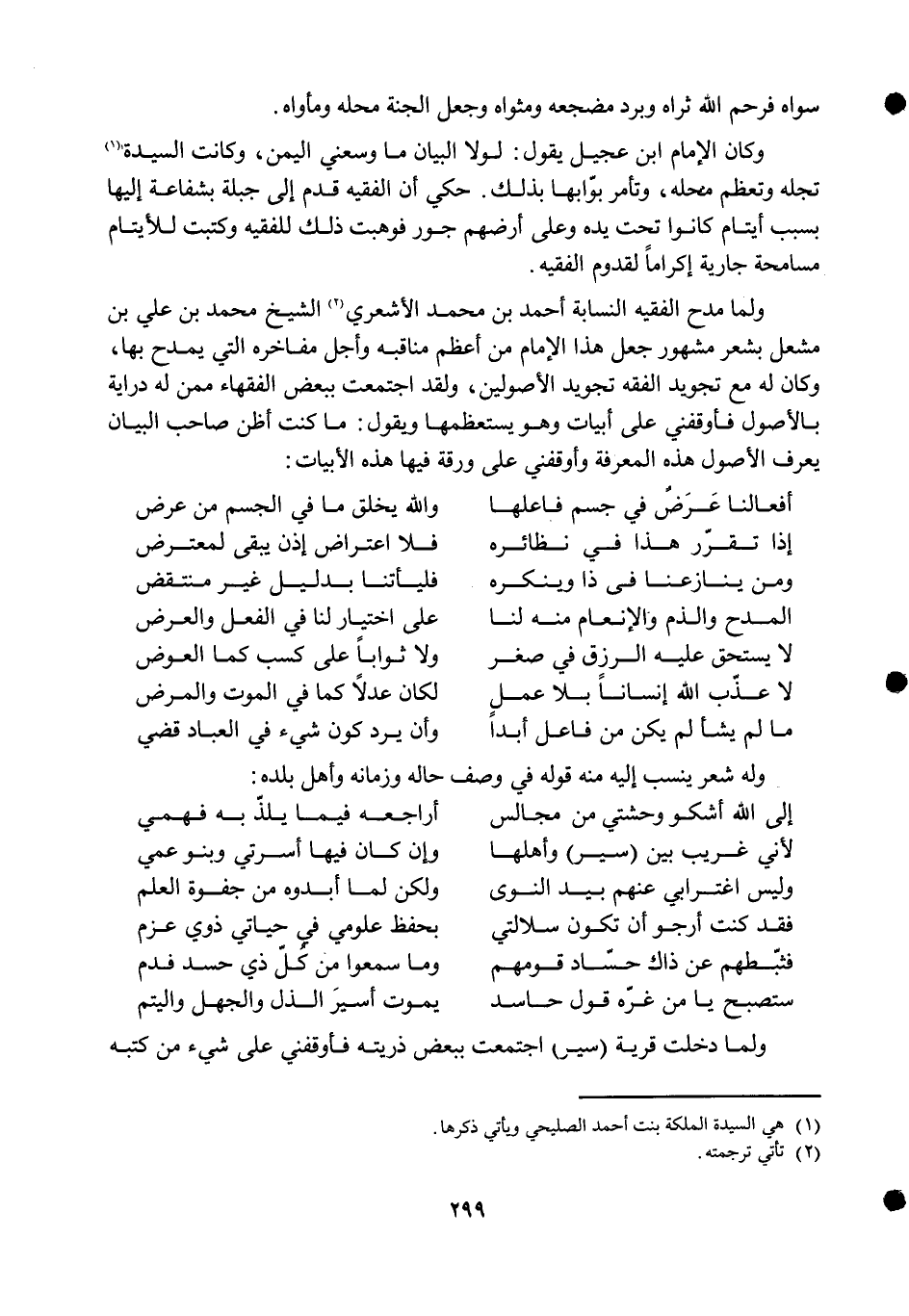 وَلما مدح الْفَقِيه النسابة أَحْمد بن مُحَمَّد الْأَشْعَرِيّ الشَّيْخ مُحَمَّد بن عَليّ بن مشعل بِشعر مَشْهُور جعل هَذَا الإِمَام من أعظم مناقبه وَأجل مفاخره الَّتِي يمدح بهَا وَكَانَ لَهُ مَعَ تجويد الْفِقْه تجويد الأصولين وَلَقَد اجْتمعت بِبَعْض الْفُقَهَاء مِمَّن لَهُ دراية بالأصول فأوقفني على أَبْيَات وَهُوَ يستعظمها وَيَقُول مَا كنت أَظن صَاحب الْبَيَان يعرف الْأُصُول هَذِه الْمعرفَة وأوقفني على ورقة فِيهَا هَذِه الأبيات ... أفعالنا عرض فِي جسم فاعلها ... وَالله يخلق مَا فِي الْجِسْم من عرض