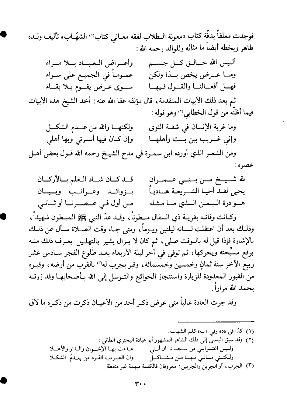 وَإِنِّي غَرِيب بَين بست وَأَهْلهَا ... وَإِن كَانَ فِيهَا أسرتي وَبهَا أَهلِي ... وَمن الشّعْر الَّذِي أوردهُ ابْن سَمُرَة فِي مدح الشَّيْخ رَحمَه الله قَول بعض أهل عصره ... لله شيخ من بني عمرَان ... قد كَانَ شاد الْعلم بالأركان