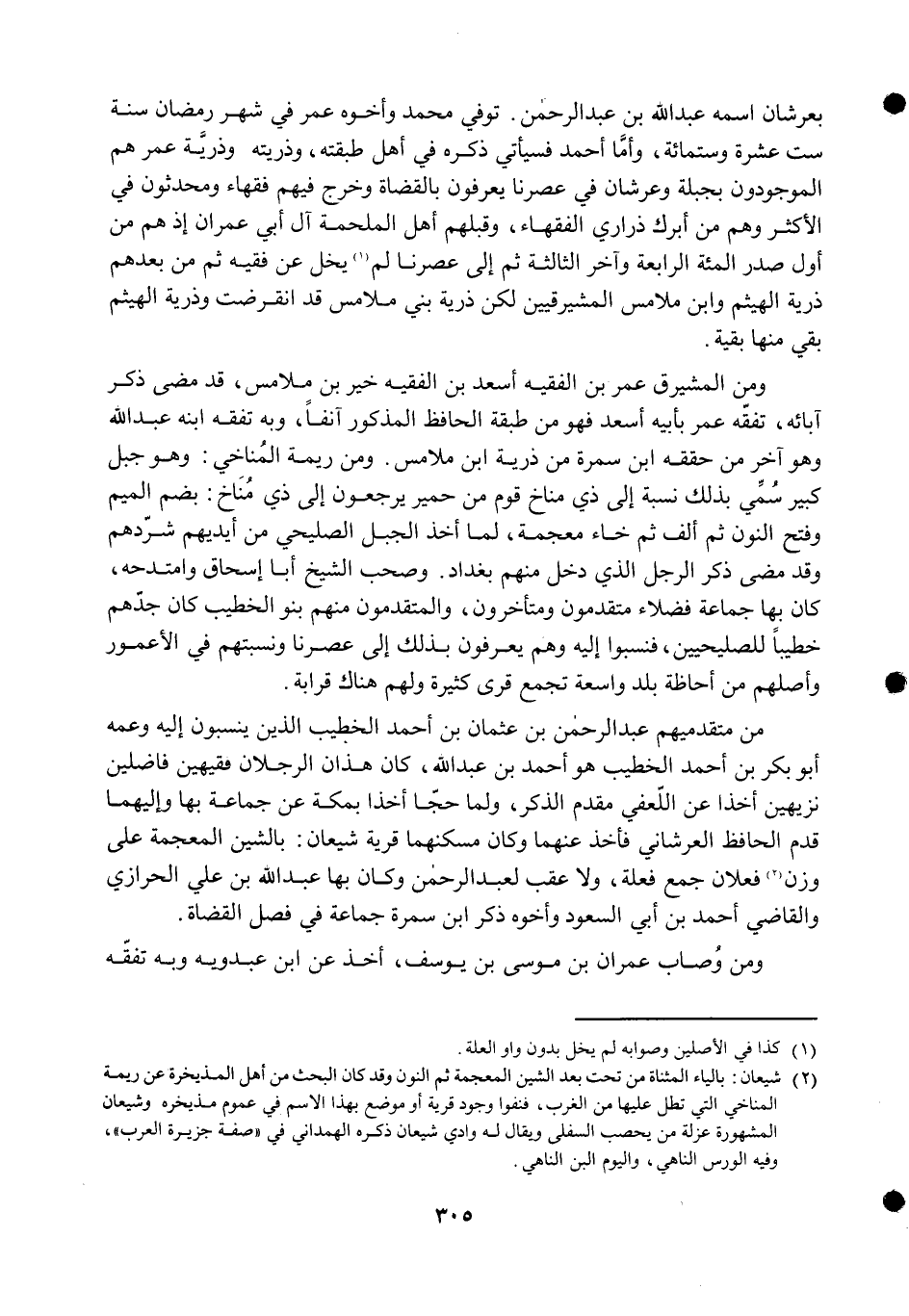 من متقدميهم عبد الرَّحْمَن بن عُثْمَان بن أَحْمد الْخَطِيب الَّذين ينسبون إِلَيْهِ وَعَمه أَبُو بكر بن أَحْمد الْخَطِيب هُوَ أَحْمد بن عبد الله كَانَ هَذَانِ الرّجلَانِ فقيهين فاضلين نزيهين أخذا عَن اللعفي مقدم الذّكر وَلما حجا أخذا بِمَكَّة عَن جمَاعَة بهَا وإليهما قدم الْحَافِظ العرشاني فَأخذ عَنْهُمَا وَكَانَ مسكنهما قَرْيَة شيعان بالشين الْمُعْجَمَة على وزن فعلان جمع فعلة وَلَا عقب لعبد الرَّحْمَن وَكَانَ بهَا عبد الله بن عَليّ الْحرَازِي وَالْقَاضِي أَحْمد بن أبي السُّعُود وَأَخُوهُ ذكر ابْن سَمُرَة جمَاعَة فِي فصل الْقُضَاة