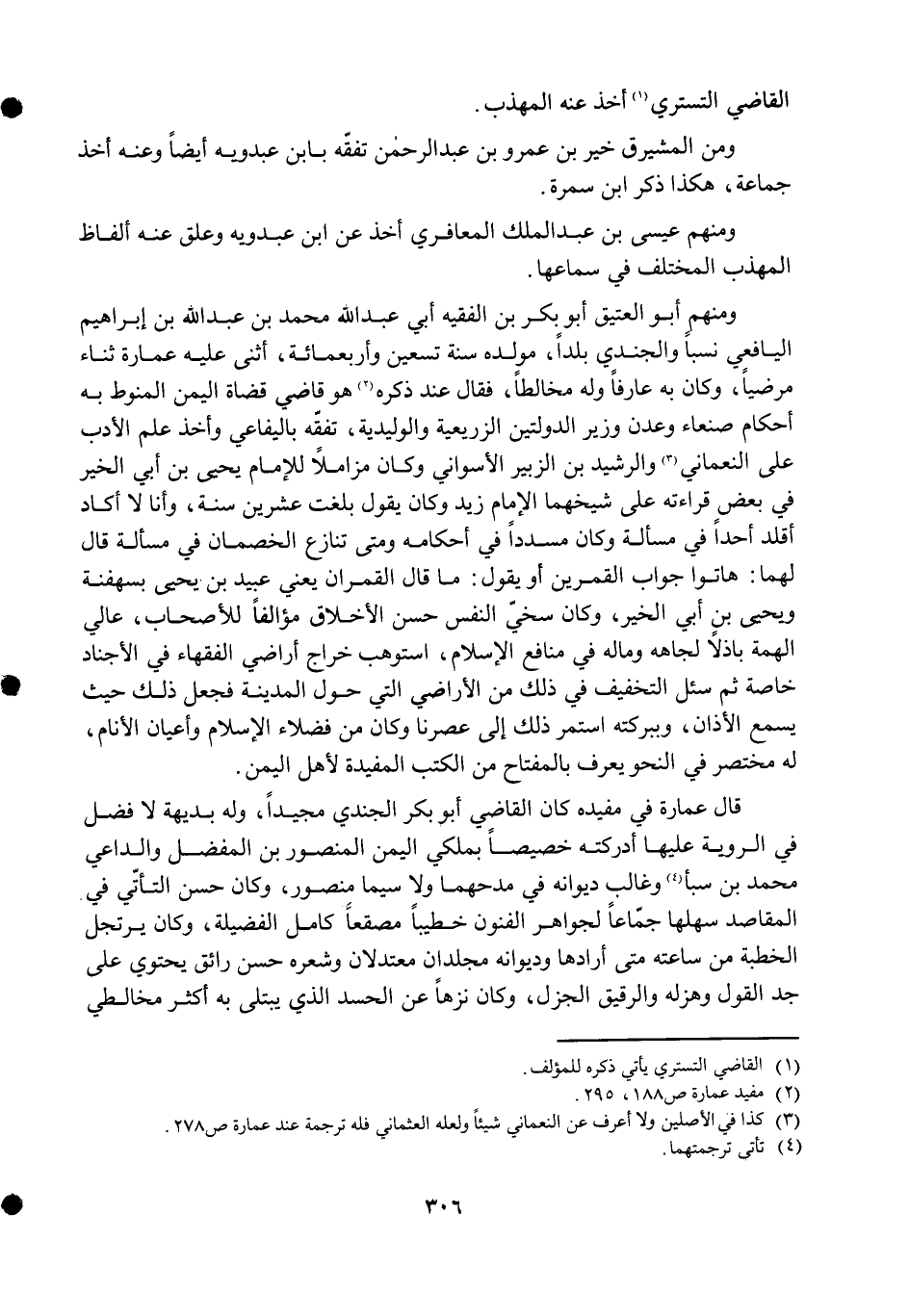 وَمِنْهُم أَبُو الْعَتِيق أَبُو بكر بن الْفَقِيه أبي عبد الله مُحَمَّد بن عبد الله بن إِبْرَاهِيم اليافعي نسبا والجندي بَلَدا مولده سنة تسعين وَأَرْبَعمِائَة أثنى عَلَيْهِ عمَارَة ثَنَاء مرضيا وَكَانَ بِهِ عَارِفًا وَله مخالطا فَقَالَ عِنْد ذكره هُوَ قَاضِي قُضَاة الْيمن المنوط بِهِ أَحْكَام صنعاء وعدن وَزِير الدولتين الزريعية والوليدية تفقه باليفاعي وَأخذ علم الْأَدَب على النعماني والرشيد بن الزبير الأسواني وَكَانَ مزاملا للْإِمَام يحيى بن أبي الْخَيْر فِي بعض قِرَاءَته على شيخهما الإِمَام زيد وَكَانَ يَقُول بلغت عشْرين سنة وَأَنا لَا أكاد أقلد أحدا فِي مَسْأَلَة وَكَانَ مُسَددًا فِي أَحْكَامه وَمَتى تنَازع الخصمان فِي مَسْأَلَة قَالَ لَهما هاتوا جَوَاب القمرين أَو يَقُول مَا قَالَ القمران يَعْنِي عبيد بن يحيى بسهفنة وَيحيى بن أبي الْخَيْر وَكَانَ سخي النَّفس حسن الْأَخْلَاق مؤالفا للأصحاب عالي الهمة باذلا لجاهه وَمَاله فِي مَنَافِع الْإِسْلَام استوهب خراج أَرَاضِي الْفُقَهَاء فِي الأجناد خَاصَّة ثمَّ سُئِلَ التَّخْفِيف فِي ذَلِك من الْأَرَاضِي الَّتِي حول الْمَدِينَة فَجعل ذَلِك حَيْثُ يسمع الْأَذَان وببركته اسْتمرّ ذَلِك إِلَى عصرنا وَكَانَ من فضلاء الْإِسْلَام وأعيان الْأَنَام لَهُ مُخْتَصر فِي النَّحْو يعرف بالمفتاح من الْكتب المفيدة لأهل الْيمن