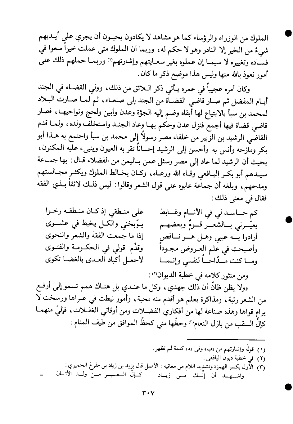 وَكَانَ أمره عجيبا فِي عمره يَأْتِي ذكر اللَّائِق من ذَلِك وَولي الْقَضَاء فِي الْجند أَيَّام الْمفضل ثمَّ صَار قَاضِي الْقُضَاة من الْجند إِلَى صنعاء ثمَّ لما صَارَت الْبِلَاد لمُحَمد بن سبأ بالابتياع لَهَا أبقاه وَضم إِلَيْهِ الجؤة وعدن وَأبين ولحج ونواحيها فَصَارَ قَاضِي قُضَاة فِيهَا أجمع فَنزل عدن وَحكم بهَا وَعَاد الْجند واستخلف وَلَده وَلما قدم القَاضِي الرشيد بن الزبير من خلفاء مصر رَسُولا إِلَى مُحَمَّد بن سبأ وَاجْتمعَ بِهِ هَذَا أَبُو بكر ومازحه وَأنس بِهِ وَأحسن إِلَى الرشيد إحسانا تقر بِهِ الْعُيُون وينبىء عَلَيْهِ الْمكنون بِحَيْثُ أَن الرشيد لما عَاد إِلَى مصر وَسُئِلَ عَمَّن بِالْيمن من الْفُضَلَاء قَالَ بهَا جمَاعَة سيدهم أَبُو بكر اليافعي وَقَاه الله ورعاه وَكَانَ يخالط الْمُلُوك وَيكثر مجالستهم ومدحهم وبلغه أَن جمَاعَة عابوه على قَول الشّعْر وَقَالُوا لَيْسَ ذَلِك لائقا بِذِي الْفِقْه فَقَالَ فِي معنى ذَلِك ... كم حَاسِد لي فِي الْأَنَام وغابط ... على منطقي إِذْ كَانَ مَنْطِقه رخوا