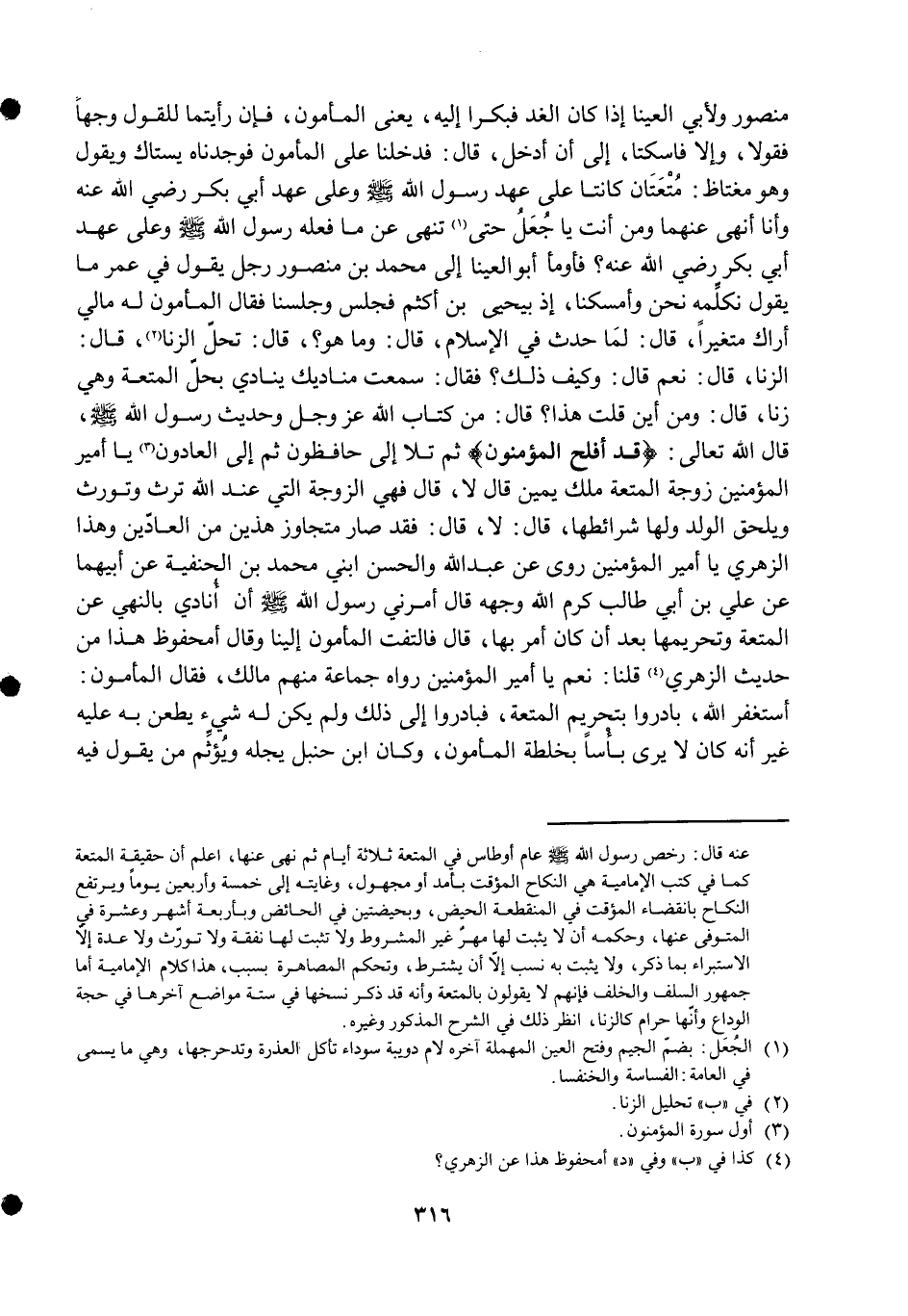 مَنْصُور وَلأبي العينا إِذا كَانَ الْغَد فبكرا إِلَيْهِ يعْنى الْمَأْمُون فَإِن رَأَيْتُمَا لِلْقَوْلِ وَجها فقولا وَإِلَّا فاسكتا إِلَى أَن أَدخل قَالَ فَدَخَلْنَا على الْمَأْمُون فوجدناه يستاك وَيَقُول وَهُوَ مغتاظ متعتان كَانَتَا على عهد رَسُول الله صلى الله عَلَيْهِ وَسلم وعَلى عهد أبي بكر رَضِي الله عَنهُ وَأَنا أنهى عَنْهُمَا وَمن أَنْت يَا جعل حَتَّى تنْهى عَن مَا فعله رَسُول الله صلى الله عَلَيْهِ وَسلم وعَلى عهد أبي بكر رَضِي الله عَنهُ فَأَوْمأ أَبُو العينا إِلَى مُحَمَّد بن مَنْصُور رجل يَقُول فِي عمر مَا يَقُول نكلمه نَحن وأمسكنا إِذْ بِيَحْيَى بن أَكْثَم فَجَلَسَ وَجَلَسْنَا فَقَالَ الْمَأْمُون لَهُ مَالِي أَرَاك متغيرا قَالَ لما حدث فِي الْإِسْلَام قَالَ وَمَا هُوَ قَالَ تحل الزِّنَا قَالَ الزِّنَا قَالَ نعم قَالَ وَكَيف ذَلِك فَقَالَ سَمِعت مناديك يُنَادي بِحل الْمُتْعَة وَهِي زنا قَالَ وَمن أَيْن قلت هَذَا قَالَ من كتاب الله عز وَجل وَحَدِيث رَسُول الله صلى الله عَلَيْهِ وَسلم قَالَ الله تَعَالَى {قد أَفْلح الْمُؤْمِنُونَ} ثمَّ تَلا إِلَى حافظون ثمَّ إِلَى العادون يَا أَمِير الْمُؤمنِينَ زَوْجَة الْمُتْعَة ملك يَمِين قَالَ لَا قَالَ فَهِيَ الزَّوْجَة الَّتِي عِنْد الله تَرث وتورث وَيلْحق الْوَلَد وَلها شرائطها قَالَ لَا قَالَ فقد صَار متجاوز هذَيْن من العادين وَهَذَا الزُّهْرِيّ يَا أَمِير الْمُؤمنِينَ روى عَن عبد الله وَالْحسن ابْني مُحَمَّد بن الْحَنَفِيَّة عَن أَبِيهِمَا عَن عَليّ بن أبي طَالب كرم الله وَجهه قَالَ أَمرنِي رَسُول الله صلى الله عَلَيْهِ وَسلم أَن أنادي بِالنَّهْي عَن الْمُتْعَة وتحريمها بعد أَن كَانَ أَمر بهَا قَالَ فَالْتَفت الْمَأْمُون إِلَيْنَا وَقَالَ أمحفوظ هَذَا من حَدِيث الزُّهْرِيّ قُلْنَا نعم يَا أَمِير الْمُؤمنِينَ رَوَاهُ جمَاعَة مِنْهُم مَالك فَقَالَ الْمَأْمُون أسْتَغْفر الله بَادرُوا بِتَحْرِيم الْمُتْعَة فبادروا إِلَى ذَلِك وَلم يكن لَهُ شَيْء يطعن بِهِ عَلَيْهِ غير أَنه كَانَ لَا يرى بَأْسا بخلطة الْمَأْمُون وَكَانَ ابْن حَنْبَل يجله ويؤثم من يَقُول فِيهِ