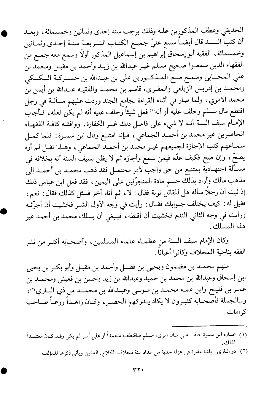 وَكَانَ الإِمَام سيف السّنة من عُظَمَاء عُلَمَاء الْمُسلمين وَأَصْحَابه أَكثر من نشر الْفِقْه بِنَاحِيَة المخلاف وَكَانُوا أعيانا
