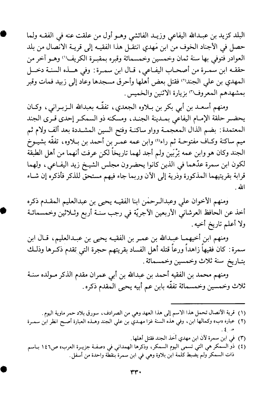 الْبَلَد كزيد بن عبد الله اليفاعي وَزيد الفائشي وَهُوَ أول من علقت عَنهُ فِي الْفِقْه وَلما حصل فِي الأجناد الْخَوْف من ابْن مهْدي انْتقل هَذَا الْفَقِيه إِلَى قَرْيَة الانصال من بلد العوادر فَتوفي بهَا سنة ثَمَان وَخمسين وَخَمْسمِائة وقبره بمقبرة الكريف وَهُوَ آخر من حَقَّقَهُ ابْن سَمُرَة من أَصْحَاب اليفاعي قَالَ ابْن سَمُرَة وَفِي هَذِه السّنة دخل الْمهْدي بن عَليّ الْجند فَقتل بعض أَهلهَا وأحرق مَسْجِدهَا وَعَاد إِلَى زبيد فَمَاتَ وقبر بمشهدهم الْمَعْرُوف بزيارة الِاثْنَيْنِ وَالْخَمِيس