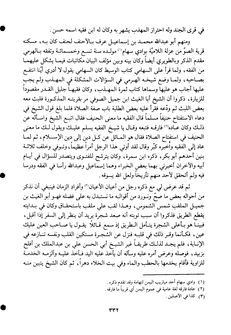 وَمِنْهُم أَبُو عبد الله مُحَمَّد بن إِسْمَاعِيل عرف بالأحنف لحنف كَانَ بِهِ مَسْكَنه قَرْيَة الصو من عزلة اللامية بوادي سِهَام مولده سنة تسع وَخَمْسمِائة وتفقه بالهرمي مقدم الذّكر وبالطويري أَيْضا وَكَانَ بَينه وَبَين مؤلف الْبَيَان مكاتبات فِيمَا يشكل عَلَيْهِمَا من الْفِقْه وَلما قَرَأَ على السهامي كتاب الْوَسِيط كَانَ السهامي يَقُول لَا أَدْرِي أَيّنَا انْتفع بِصَاحِبِهِ وَلما وضع شَيْخه الهرمي فِي السؤالات المشكلة فِي الْمُهَذّب وَلم يجب عَلَيْهَا أجَاب هُوَ عَلَيْهَا وسماها كتاب ثَمَرَة الْمُهَذّب وَكَانَ فَقِيها جليل الْقدر مَقْصُودا للزيارة ذكرُوا أَن الشَّيْخ أَبَا الْغَيْث ابْن جميل الصُّوفِي مر بقريته الْمَذْكُورَة فَلبث مَعَه بعض اللّّبْث ثمَّ ودعه فَقَرَأَ عَلَيْهِ بعض الطّلبَة بَاب صفة الصَّلَاة فَلَمَّا بلغ قَول الشَّيْخ فِي دُعَاء الاستفتاح حَنِيفا مُسلما قَالَ الْفَقِيه مَا معنى الحنيف فَقَالَ اتبع الشَّيْخ واسأله عَن ذَلِك وَكَانَ عَاده فَارقه فَتَبِعَهُ وَقَالَ يَا شيخ الْفَقِيه يسلم عَلَيْك وَيَقُول لَك مَا معنى الحنيف فِي استفتاح الصَّلَاة فَقَالَ هُوَ المائل عَن كل دين إِلَى دين الْإِسْلَام ثمَّ لما عَاد إِلَى الْفَقِيه وَأخْبرهُ كبر وَقَالَ لقد أُوتِيَ هَذَا الرجل أمرا عَظِيما وَتُوفِّي وَخلف ثَلَاثَة بَنِينَ أحدهم أَبُو بكر ذكره ابْن سَمُرَة وَكَانَ يترشح للْفَتْوَى ويتصدر للسؤال فِي أَيَّام أَبِيه والآخران أَخْبرنِي بهما بعض الخبراء وهما إِسْمَاعِيل وَعبد الله رَأْسا فِي الْفِقْه ودرسا فِيهِ وَلم أتحقق لأحد مِنْهُم تأريخا وَلَعَلَّ الله يَسُوقهُ