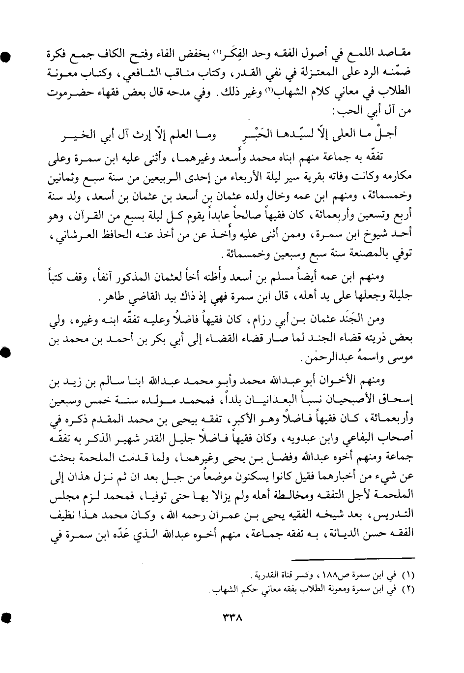 وَفِي مدحه قَالَ بعض فُقَهَاء حضر موت من آل أبي الْحبّ ... أجل مَا العلى إِلَّا لسَيِّدهَا الحبر ... وَمَا الْعلم إِلَّا إِرْث آل أبي الْخَيْر ... تفقه بِهِ جمَاعَة مِنْهُم ابناه مُحَمَّد وأسعد وَغَيرهمَا وَأثْنى عَلَيْهِ ابْن سَمُرَة وعَلى مكارمه وَكَانَت وَفَاته بقرية سير لَيْلَة الْأَرْبَعَاء من إِحْدَى الربيعين من سنة سبع وَثَمَانِينَ وَخَمْسمِائة وَمِنْهُم ابْن عَمه وخال وَلَده عُثْمَان بن أسعد بن عُثْمَان بن أسعد ولد سنة أَربع وَتِسْعين وَأَرْبَعمِائَة كَانَ فَقِيها صَالحا عابدا يقوم كل لَيْلَة بِسبع من الْقُرْآن وَهُوَ أحد شُيُوخ ابْن سَمُرَة وَمِمَّنْ أثنى عَلَيْهِ وَأخذ عَن من أَخذ عَنهُ الْحَافِظ العرشاني توفّي بالمصنعة سنة سبع وَسبعين وَخَمْسمِائة