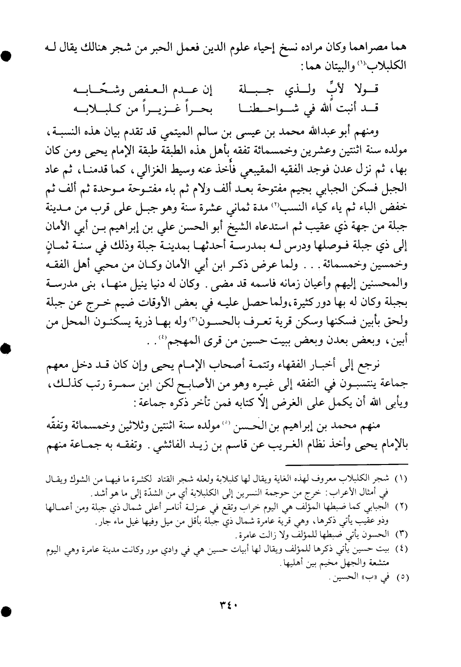 هما مصراهما وَكَانَ مُرَاده نسخ إحْيَاء عُلُوم الدّين فَعمل الحبر من شجر هُنَالك يُقَال لَهُ الكلبلاب والبيتان هما ... قولا لأَب وَلِذِي جبلة ... إِن عدم العفص وشحابه