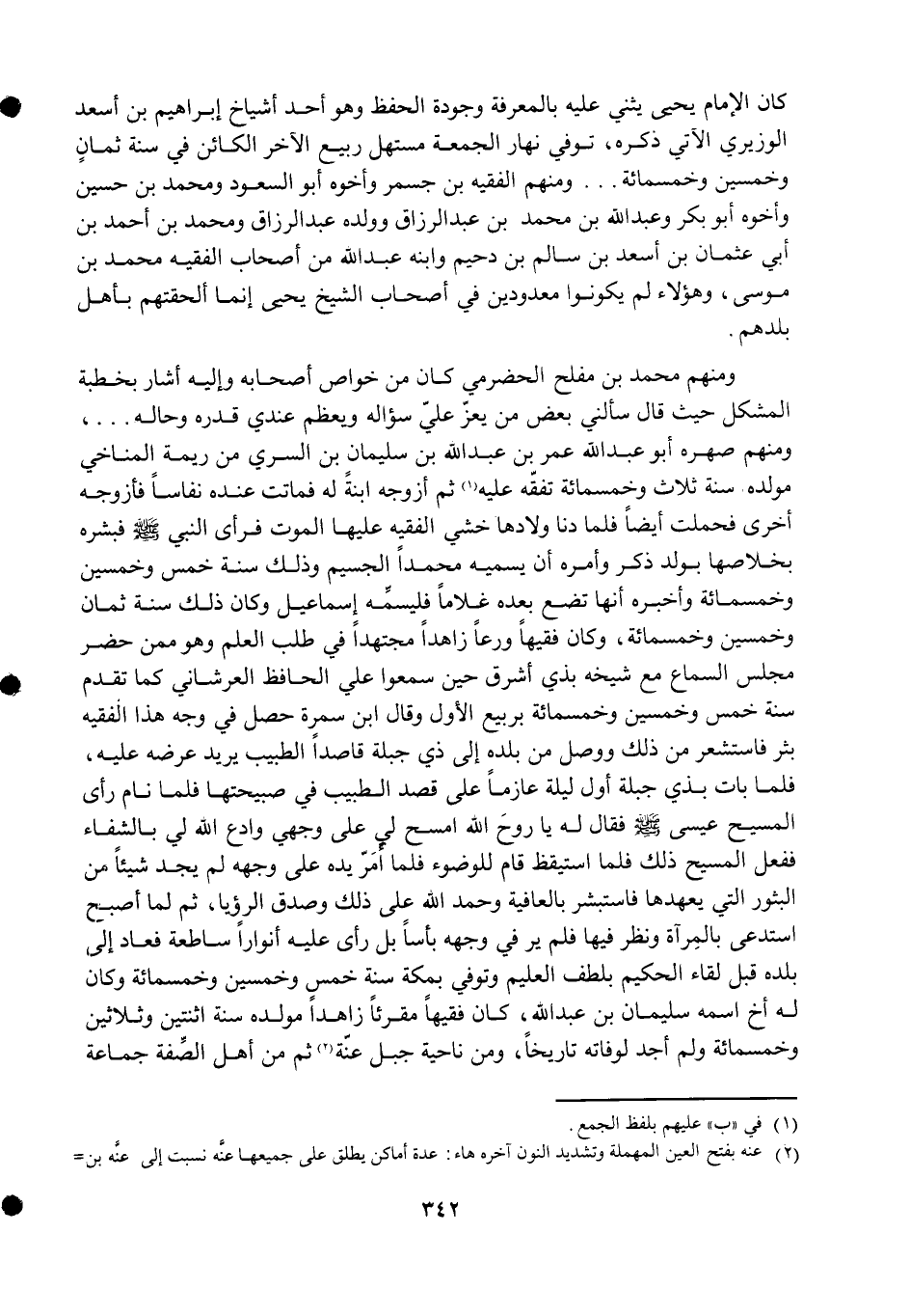 وَمِنْهُم صهره أَبُو عبد الله عمر بن عبد الله بن سُلَيْمَان بن السّري من ريمة المناخي مولده سنة ثَلَاث وَخَمْسمِائة تفقه عَلَيْهِ ثمَّ أزَوجهُ ابْنة لَهُ فَمَاتَتْ عِنْده نفاسا فأزوجه أُخْرَى فَحملت أَيْضا فَلَمَّا دنا ولادها خشِي الْفَقِيه عَلَيْهَا الْمَوْت فَرَأى النَّبِي صلى الله عَلَيْهِ وَسلم فبشره بخلاصها بِولد ذكر وَأمره أَن يُسَمِّيه مُحَمَّدًا الجسيم وَذَلِكَ سنة خمس وَخمسين وَخَمْسمِائة وَأخْبرهُ أَنَّهَا تضع بعده غُلَاما فليسمه إِسْمَاعِيل وَكَانَ ذَلِك سنة ثَمَان وَخمسين وَخَمْسمِائة وَكَانَ فَقِيها ورعا زاهدا مُجْتَهدا فِي طلب الْعلم وَهُوَ مِمَّن حضر مجْلِس السماع مَعَ شَيْخه بِذِي أشرق حِين سمعُوا عَليّ الْحَافِظ العرشاني كَمَا تقدم بثر فاستشعر من ذَلِك وَوصل من بَلَده إِلَى ذِي جبلة قَاصِدا الطَّبِيب يُرِيد عرضه عَلَيْهِ فَلَمَّا بَات بِذِي جبلة أول لَيْلَة عَازِمًا على قصد الطَّبِيب فِي صبيحتها فَلَمَّا نَام رأى الْمَسِيح عِيسَى صلى الله عَلَيْهِ وَسلم فَقَالَ لَهُ يَا روح الله امسح لي على وَجْهي وادع الله لي بالشفاء فَفعل الْمَسِيح ذَلِك فَلَمَّا اسْتَيْقَظَ قَامَ للْوُضُوء فَلَمَّا أَمر يَده على وَجهه لم يجد شَيْئا من البثور الَّتِي يعهدها فَاسْتَبْشَرَ بالعافية وَحمد الله على ذَلِك وَصدق الرُّؤْيَا ثمَّ لما أصبح استدعى بالمرآة وَنظر فِيهَا فَلم ير فِي وَجهه بَأْسا بل رأى عَلَيْهِ أنوارا ساطعة فَعَاد إِلَى بَلَده قبل لِقَاء الْحَكِيم بلطف الْعَلِيم وَتُوفِّي بِمَكَّة سنة خمس وَخمسين وَخَمْسمِائة وَكَانَ لَهُ أَخ اسْمه سُلَيْمَان بن عبد الله كَانَ فَقِيها مقرئا زاهدا مولده سنة اثْنَتَيْنِ وَثَلَاثِينَ وَخَمْسمِائة وَلم أجد لوفاته تَارِيخا وَمن نَاحيَة جبل عنة ثمَّ من أهل الصّفة جمَاعَة