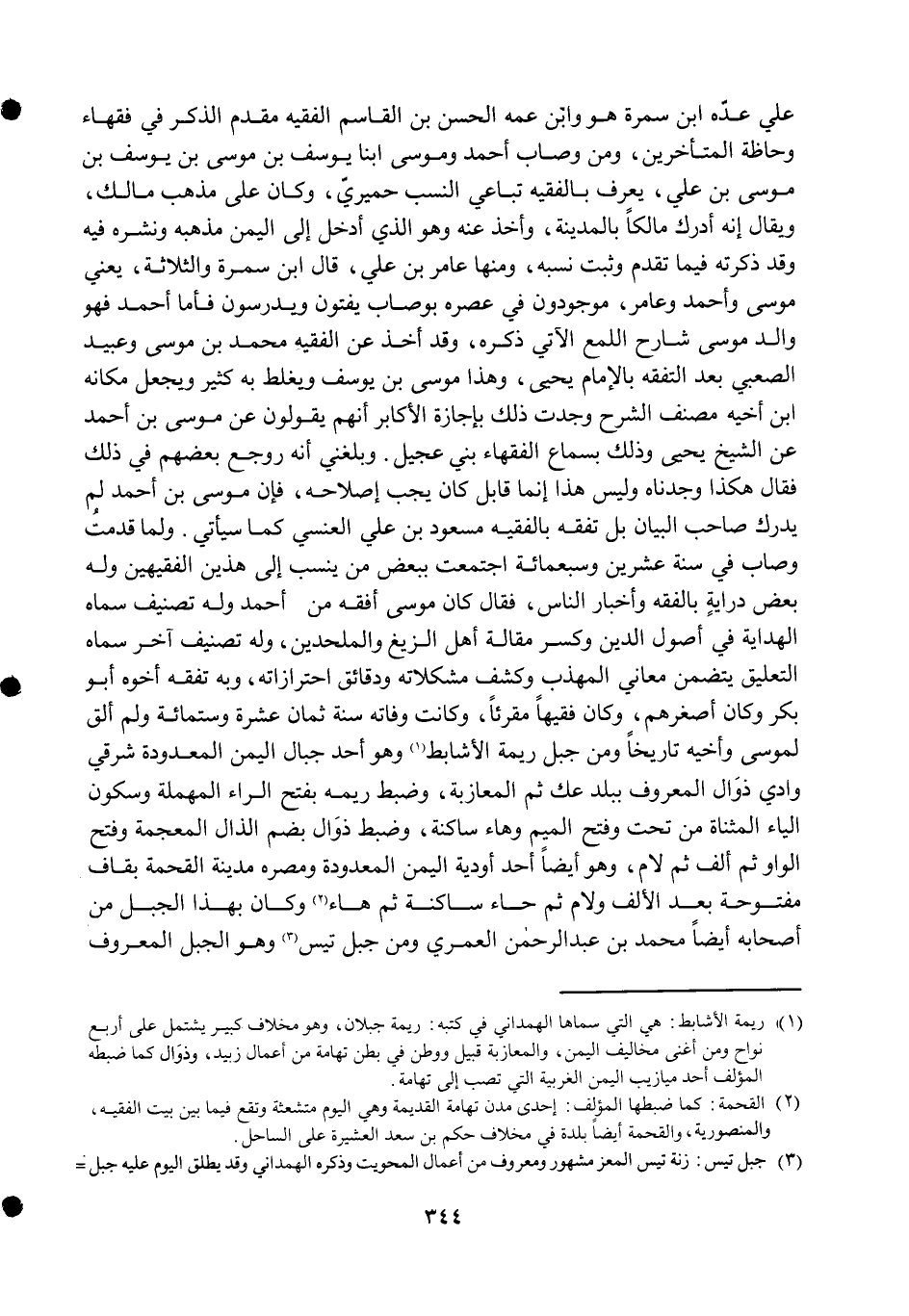 وَلما قدمت وصاب فِي سنة عشْرين وَسَبْعمائة اجْتمعت بِبَعْض من ينْسب إِلَى هذَيْن الفقيهين وَله بعض دراية بالفقه وأخبار النَّاس فَقَالَ كَانَ مُوسَى أفقه من أَحْمد وَله تصنيف سَمَّاهُ الْهِدَايَة فِي أصُول الدّين وَكسر مقَالَة أهل الزيغ والملحدين وَله تصنيف آخر سَمَّاهُ التَّعْلِيق يتَضَمَّن مَعَاني الْمُهَذّب وكشف مكشلاته ودقائق احترازاته وَبِه تفقه أَخُوهُ أَبُو بكر وَكَانَ أَصْغَرهم وَكَانَ فَقِيها مقرئا وَكَانَت وَفَاته سنة ثَمَان عشرَة وسِتمِائَة وَلم ألق لمُوسَى وأخيه تَارِيخا وَمن جبل ريمة الأشابط وَهُوَ أحد جبال الْيمن المعدودة شَرْقي وَادي ذوال الْمَعْرُوف بِبَلَد عك ثمَّ المعازبة وَضبط ريمه بِفَتْح الرَّاء الْمُهْملَة وَسُكُون الْيَاء الْمُثَنَّاة من تَحت وَفتح الْمِيم وهاء سَاكِنة وَضبط ذوال بِضَم الذَّال الْمُعْجَمَة وَفتح الْوَاو ثمَّ ألف ثمَّ لَام وَهُوَ أَيْضا أحد أَوديَة الْيمن المعدودة ومصره مَدِينَة القحمة بقاف مَفْتُوحَة بعد الْألف وَلَا م ثمَّ حاء سَاكِنة ثمَّ هَاء وَكَانَ بِهَذَا الْجَبَل من أَصْحَابه أَيْضا مُحَمَّد بن عبد الرَّحْمَن الْعمريّ وَمن جبل تَيْس وَهُوَ الْجَبَل الْمَعْرُوف