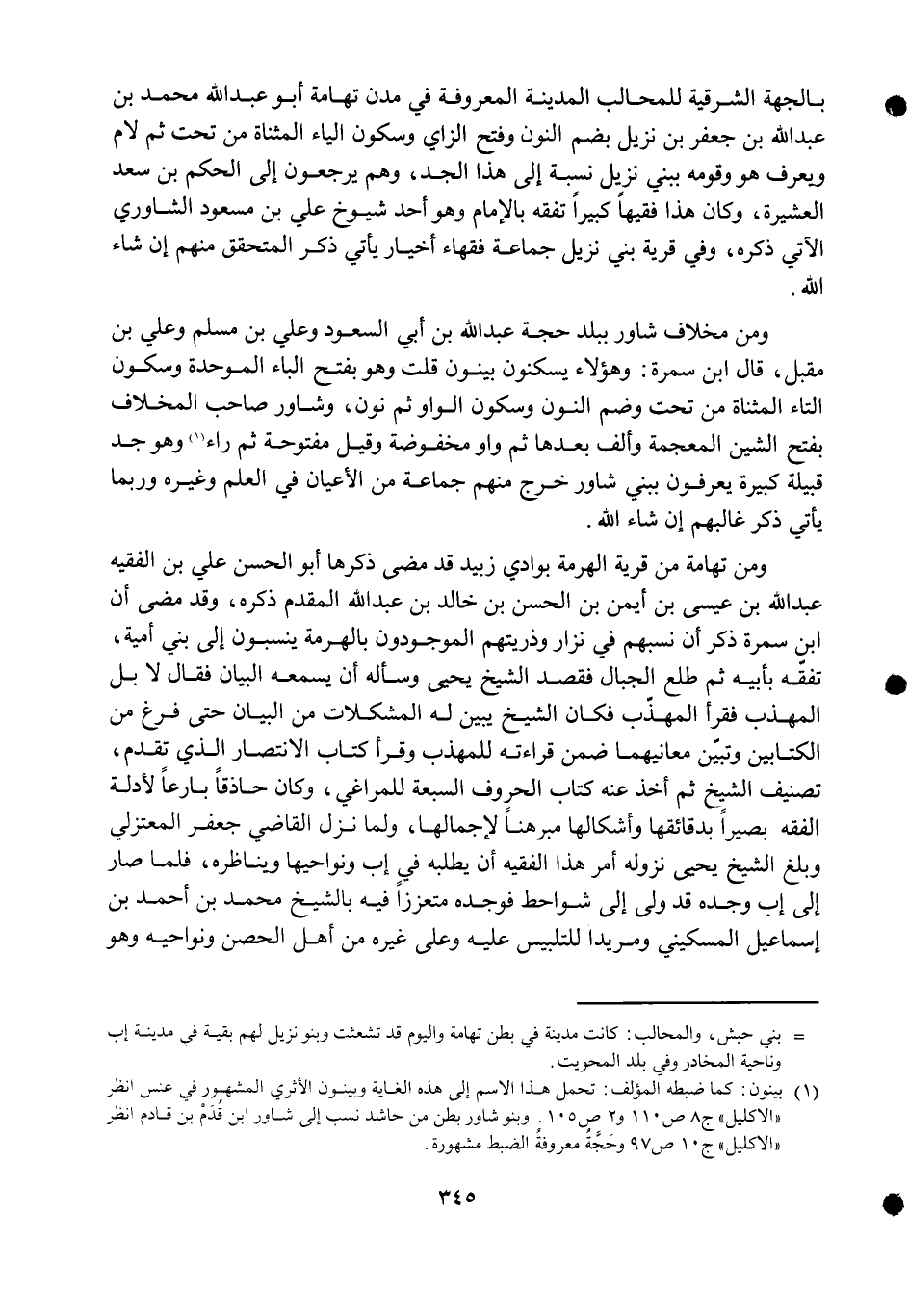 بالجهة الشرقية للمحالب الْمَدِينَة الْمَعْرُوفَة فِي مدن تهَامَة أَبُو عبد الله مُحَمَّد بن عبد الله بن جَعْفَر بن نزيل بِضَم النُّون وَفتح الزَّاي وَسُكُون الْيَاء الْمُثَنَّاة من تَحت ثمَّ لَام وَيعرف هُوَ وَقَومه ببني نزيل نِسْبَة إِلَى هَذَا الْجد وهم يرجعُونَ إِلَى الحكم بن سعد الْعَشِيرَة وَكَانَ هَذَا فَقِيها كَبِيرا تفقه بِالْإِمَامِ وَهُوَ أحد شُيُوخ عَليّ بن مَسْعُود الشاوري الْآتِي ذكره وَفِي قَرْيَة بني نزيل جمَاعَة فُقَهَاء أخيار يَأْتِي ذكر المتحقق مِنْهُم إِن شَاءَ الله