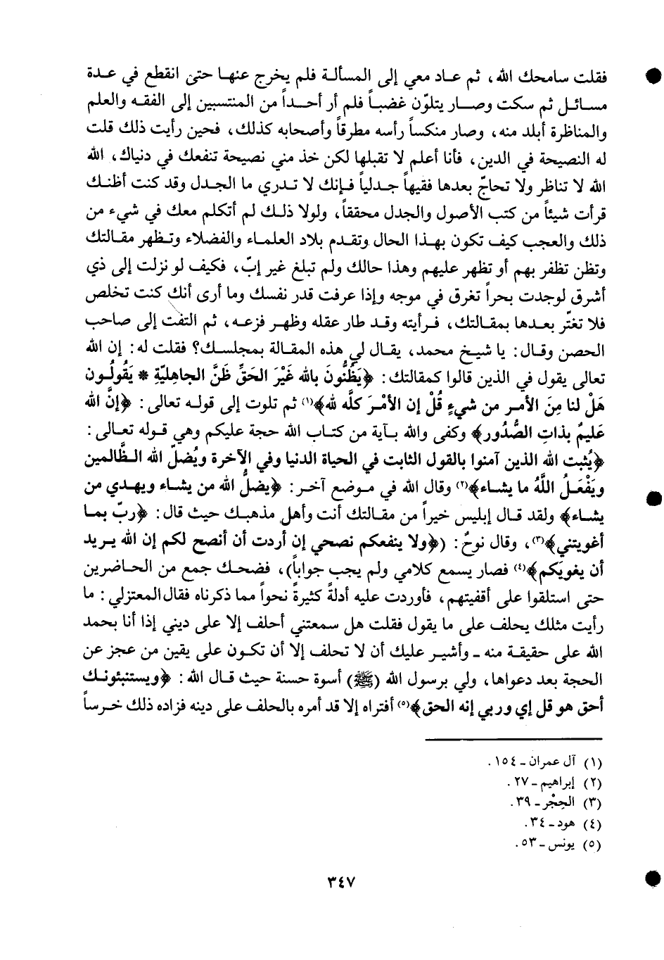فَقلت سامحك الله ثمَّ عَاد معي إِلَى الْمَسْأَلَة فَلم يخرج عَنْهَا حَتَّى انْقَطع فِي عدَّة مسَائِل ثمَّ سكت وَصَارَ يَتلون غَضبا فَلم أر أحدا من المنتسبين إِلَى الْفِقْه وَالْعلم والمناظرة أبلد مِنْهُ وَصَارَ مُنَكسًا رَأسه مطرقا وَأَصْحَابه كَذَلِك فحين رَأَيْت ذَلِك قلت لَهُ النَّصِيحَة فِي الدّين فَأَنا أعلم لَا تقبلهَا لَكِن خُذ مني نصيحة تنفعك فِي دنياك الله الله لَا تناظر وَلَا تحاج بعْدهَا فَقِيها جدليا فَإنَّك لَا تَدْرِي مَا الجدل وَقد كنت أَظُنك قَرَأت شَيْئا من كتب الْأُصُول والجدل محققا وَلَوْلَا ذَلِك لم أَتكَلّم مَعَك فِي شَيْء من ذَلِك وَالْعجب كَيفَ تكون بِهَذَا الْحَال وَتقدم بِلَاد الْعلمَاء والفضلاء وَتظهر مَقَالَتك وتظن تظفر بهم أَو تظهر عَلَيْهِم وَهَذَا حالك وَلم تبلغ غير إب فَكيف لَو نزلت إِلَى ذِي أشرق لوجدت بحرا تغرق فِي موجه وَإِذا عرفت قدر نَفسك وَمَا أرى أَنَّك كنت تخلص فَلَا تغتر بعْدهَا بمقالتك فرأيته وَقد طَار عقله وَظهر فزعه ثمَّ الْتفت إِلَى صَاحب الْحصن وَقَالَ يَا شيخ مُحَمَّد يُقَال لي هَذِه الْمقَالة بمجلسك فَقَالَ لَهُ إِن الله تَعَالَى يَقُول فِي الَّذين قَالُوا كمقالتك يظنون بِاللَّه غير الْحق ظن الْجَاهِلِيَّة يَقُولُونَ هَل لنا من الْأَمر من شَيْء قل إِن الْأَمر كُله لله ثمَّ تَلَوت إِلَى قَوْله تَعَالَى {إِن الله عليم بِذَات الصُّدُور} وَكفى وَالله بِآيَة من كتاب الله حجَّة عَلَيْكُم وَهِي قَوْله تَعَالَى {يثبت الله الَّذين آمنُوا بالْقَوْل الثَّابِت فِي الْحَيَاة الدُّنْيَا وَفِي الْآخِرَة ويضل الله الظَّالِمين وَيفْعل الله مَا يَشَاء} وَقَالَ الله فِي مَوضِع آخر {يضل الله من يَشَاء وَيهْدِي من يَشَاء} وَلَقَد قَالَ إِبْلِيس خيرا من مَقَالَتك أَنْت وَأهل مذهبك حَيْثُ قَالَ {رب بِمَا أغويتني} وَقَالَ نوح وَلَا ينفعكم نصحي إِن أردْت أَن أنصح لكم إِن الله يُرِيد أَن يغويكم فَصَارَ يسمع كَلَامي وَلم يجب جَوَابا فَضَحِك جمع من الْحَاضِرين حَتَّى استلقوا على أقفيتهم فأوردت عَلَيْهِ أَدِلَّة كَثِيرَة نَحوا مِمَّا ذَكرْنَاهُ فَقَالَ المعتزلي مَا رَأَيْت مثلك يحلف على مَا يَقُول فَقلت هَل سمعتني أَحْلف إِلَّا على ديني إِذا أَنا بِحَمْد الله على حَقِيقَة مِنْهُ وأشير عَلَيْك أَن لَا تحلف إِلَّا أَن تكون على يَقِين من عجز عَن الْحجَّة بعد دَعْوَاهَا ولي برَسُول الله صلى الله عَلَيْهِ وَسلم أُسْوَة حَسَنَة حَيْثُ قَالَ الله ويستنبئونك أَحَق هُوَ قل إِي وربي إِنَّه الْحق أفتراه إِلَّا قد أمره بِالْحلف على دينه فزاده ذَلِك خرسا