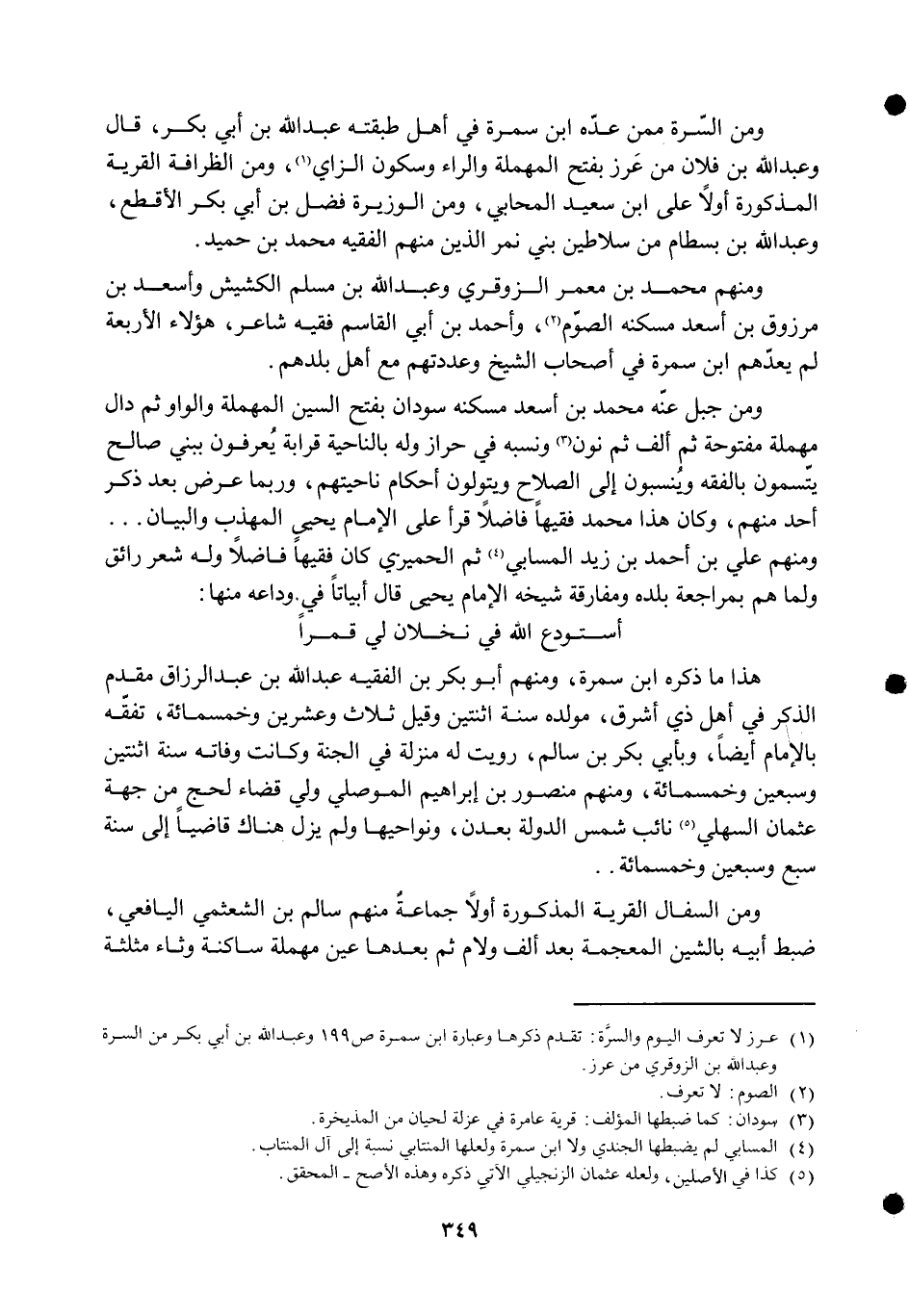 وَمن السُّرَّة مِمَّن عده ابْن سَمُرَة فِي أهل طبقته عبد الله بن أبي بكر قَالَ وَعبد الله بن فلَان من عرز بِفَتْح الْمُهْملَة وَالرَّاء وَسُكُون الزَّاي وَمن الظرافة الْقرْيَة الْمَذْكُورَة أَولا على ابْن سعيد المحابي وَمن الوزيرة فضل بن أبي بكر الأقطع وَعبد الله بن بسطَام من سلاطين بني نمر الَّذين مِنْهُم الْفَقِيه مُحَمَّد بن حميد