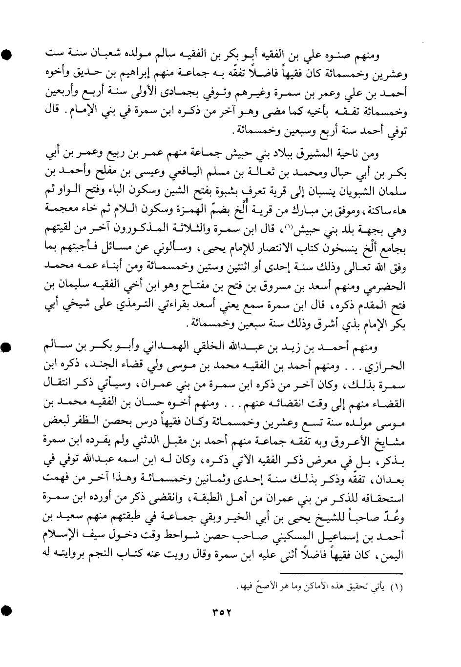 وَمِنْهُم صنوه عَليّ بن الْفَقِيه أَبُو بكر بن الْفَقِيه سَالم مولده شبعان سنة سِتّ وَعشْرين وَخَمْسمِائة كَانَ فَقِيها فَاضلا تفقه بِهِ جمَاعَة مِنْهُم إِبْرَاهِيم بن حديق وَأَخُوهُ أَحْمد بن عَليّ وَعمر بن سَمُرَة وَغَيرهم وَتُوفِّي بجمادى الأولى سنة أَربع وَأَرْبَعين وَخَمْسمِائة تفقه بأَخيه كَمَا مضى وَهُوَ آخر من ذكره ابْن سَمُرَة فِي بني الإِمَام