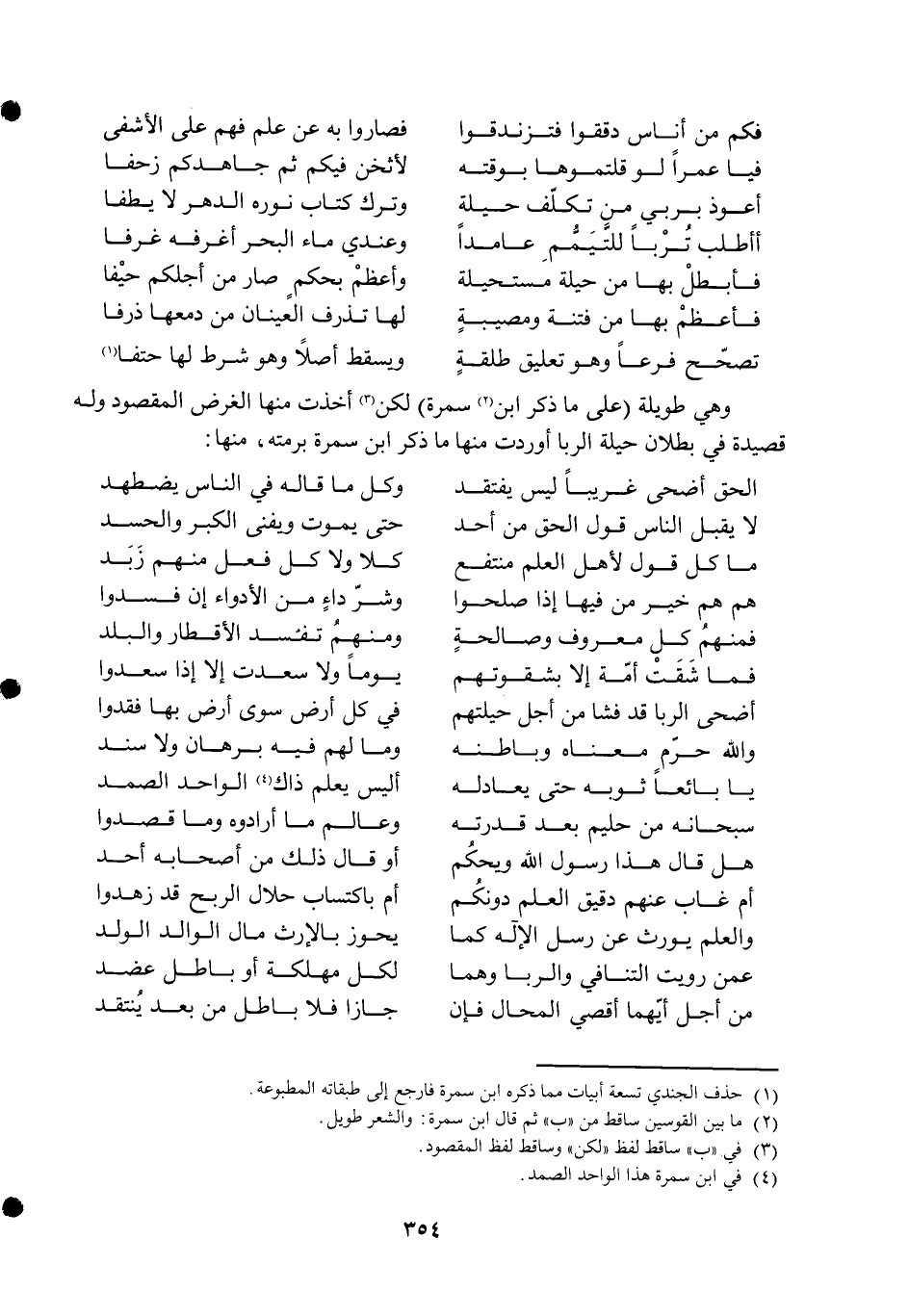 تصحح فرعا وَهُوَ تَعْلِيق طَلْقَة ... وَيسْقط أصلا وَهُوَ شَرط لَهَا حتفا ... وَهِي طَوِيلَة على مَا ذكر ابْن سَمُرَة لَكِن أخذت مِنْهَا الْغَرَض الْمَقْصُود وَله قصيدة فِي بطلَان حِيلَة الرِّبَا أوردت مِنْهَا مَا ذكر ابْن سَمُرَة برمتِهِ مِنْهَا ... الْحق أضحى غَرِيبا لَيْسَ يفتقد ... وكل مَا قَالَه فِي النَّاس يضطهد