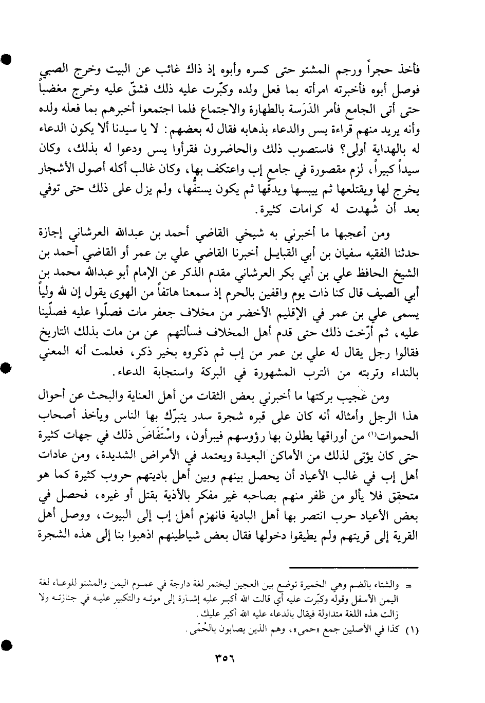 وَمن عَجِيب بركتها مَا أَخْبرنِي بعض الثِّقَات من أهل الْعِنَايَة والبحث عَن أَحْوَال هَذَا الرجل وَأَمْثَاله أَنه كَانَ على قَبره شَجَرَة سدر يتبرك بهَا النَّاس وَيَأْخُذ أَصْحَاب الحموات من أوراقها يطلون بهَا رؤوسهم فيبرأون واستفاض ذَلِك فِي جِهَات كَثِيرَة حَتَّى كَانَ يُؤْتى لذَلِك من الْأَمَاكِن الْبَعِيدَة ويعتمد فِي الْأَمْرَاض الشَّدِيدَة وَمن عادات أهل إب فِي غَالب الأعياد أَن يحصل بَينهم وَبَين أهل باديتهم حروب كَثِيرَة كَمَا هُوَ مُتَحَقق فَلَا يألو من ظفر مِنْهُم بِصَاحِبِهِ غير مفكر بالأذية بقتل أَو غَيره فَحصل فِي بعض الأعياد حَرْب انتصر بهَا أهل الْبَادِيَة فَانْهَزَمَ أهل إب إِلَى الْبيُوت وَوصل أهل الْقرْيَة إِلَى قريتهم وَلم يطيقوا دُخُولهَا فَقَالَ بعض شياطينهم اذْهَبُوا بِنَا إِلَى هَذِه الشَّجَرَة