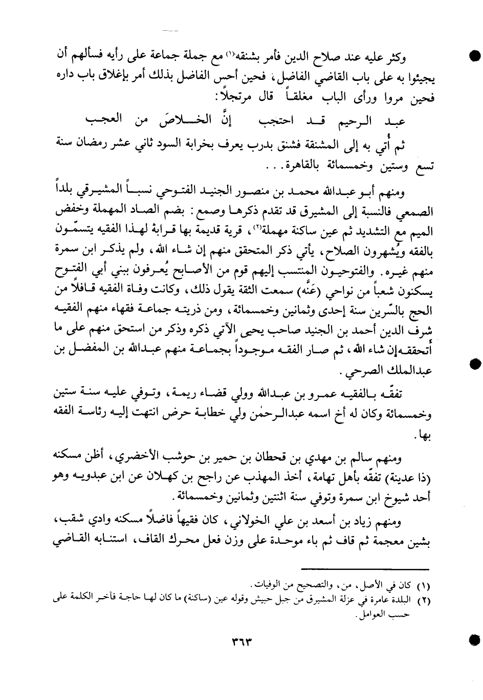 وَمِنْهُم أَبُو عبد الله مُحَمَّد بن مَنْصُور الْجُنَيْد الفتوحي نسبا المشيرقي بَلَدا الصمعي فالنسبة إِلَى المشيرق قد تقدم ذكرهَا وصمع بِضَم الصَّاد الْمُهْملَة وخفض الْمِيم مَعَ التَّشْدِيد ثمَّ عين سَاكِنة مُهْملَة قَرْيَة قديمَة بهَا قرَابَة لهَذَا الْفَقِيه يتسمون بالفقه ويشهرون الصّلاح يَأْتِي ذكر المتحقق مِنْهُم إِن شَاءَ الله وَلم يذكر ابْن سَمُرَة مِنْهُم غَيره