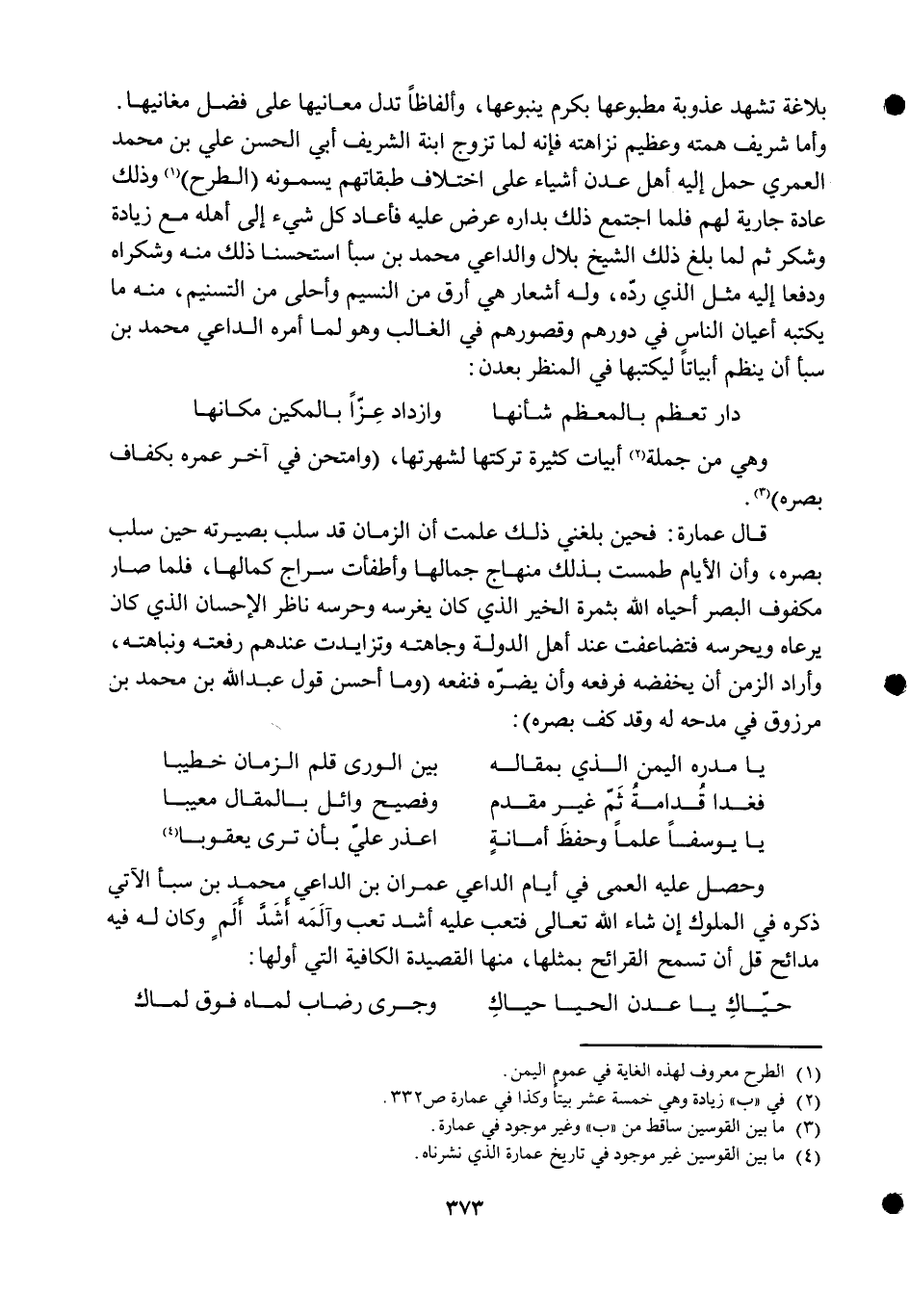 قَالَ عمَارَة فحين بَلغنِي ذَلِك علمت أَن الزَّمَان قد سلب بصيرته حِين سلب بَصَره وَأَن الْأَيَّام طمست بذلك منهاج جمَالهَا وَأَطْفَأت سراج كمالها فَلَمَّا صَار مكفوف الْبَصَر أَحْيَاهُ الله بثمرة الْخَيْر الَّذِي كَانَ يغرسه وحرسه نَاظر الْإِحْسَان الَّذِي كَانَ يرعاه ويحرسه فتضاعفت عِنْد أهل الدولة وجاهته وتزايدت عِنْدهم رفعته ونباهته وَأَرَادَ الزَّمن أَن يخفضه فرفعه وَأَن يضرّهُ فنفعه وَمَا أحسن قَول عبد الله بن مُحَمَّد بن مَرْزُوق فِي مدحه لَهُ وَقد كف بَصَره ... يَا مدره الْيمن الَّذِي بمقاله ... بَين الورى قلم الزَّمَان خَطِيبًا