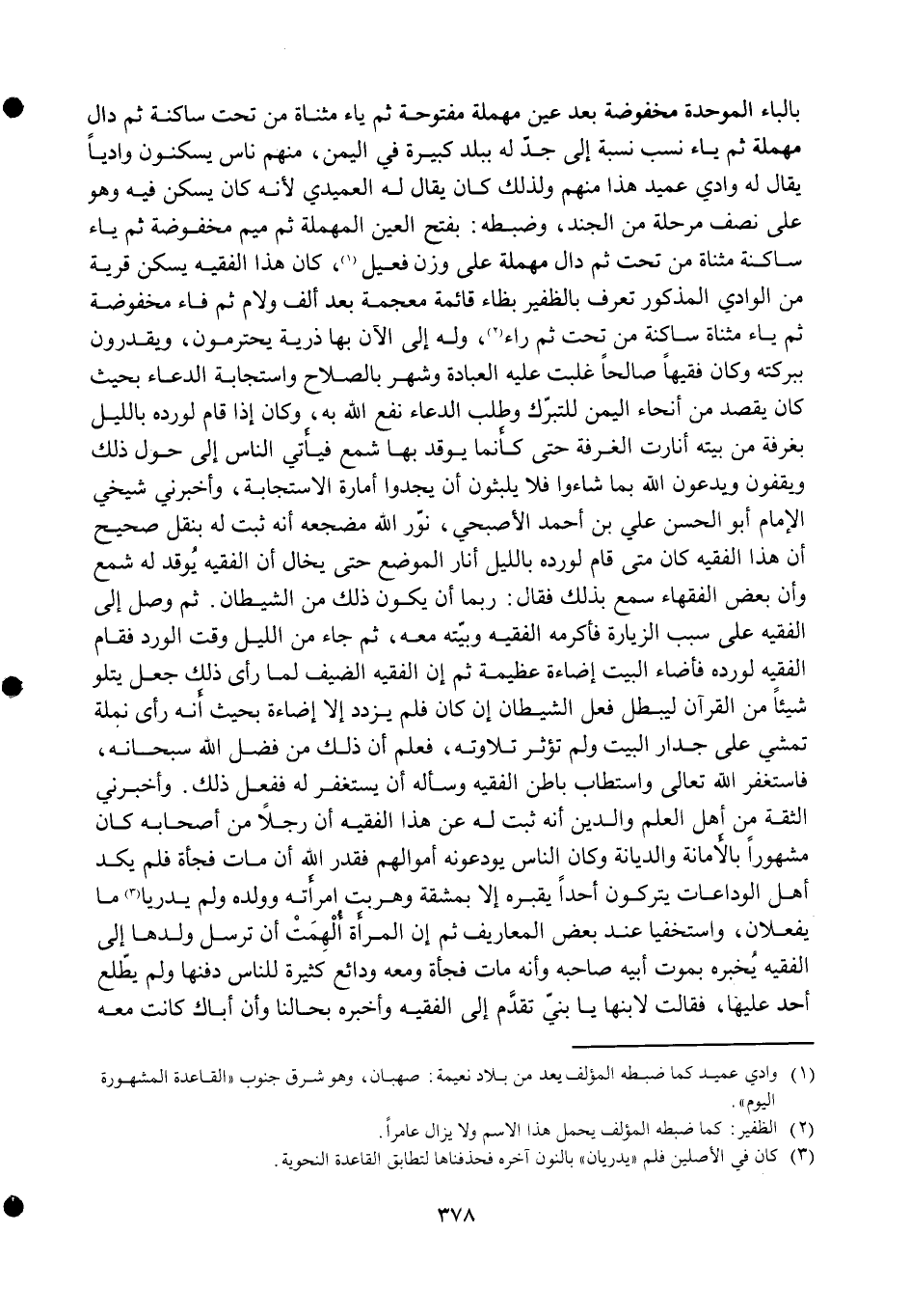بِالْبَاء الْمُوَحدَة مخفوضة بعد عين مُهْملَة مَفْتُوحَة ثمَّ يَاء مثناة من تَحت سَاكِنة ثمَّ دَال مُهْملَة ثمَّ يَاء نسب نِسْبَة إِلَى جد لَهُ بِبَلَد كَبِيرَة فِي الْيمن مِنْهُم نَاس يسكنون وَاديا يُقَال لَهُ وَادي عميد هَذَا مِنْهُم وَلذَلِك كَانَ يُقَال لَهُ العميدي لِأَنَّهُ كَانَ يسكن فِيهِ وَهُوَ على نصف مرحلة من الْجند وَضَبطه بِفَتْح الْعين الْمُهْملَة ثمَّ مِيم مخفوضة ثمَّ يَاء سَاكِنة مثناة من تَحت ثمَّ دَال مُهْملَة على وزن فعيل كَانَ هَذَا الْفَقِيه يسكن قَرْيَة من الْوَادي الْمَذْكُور تعرف بالظفير بِظَاء قَائِمَة مُعْجمَة بعد ألف وَلَام ثمَّ فَاء مخفوضة ثمَّ يَاء مثناة سَاكِنة من تَحت ثمَّ رَاء وَله إِلَى الْآن بهَا ذُرِّيَّة يحترمون ويقدرون ببركته وَكَانَ فَقِيها صَالحا غلبت عَلَيْهِ الْعِبَادَة وَشهر بالصلاح واستجابة الدُّعَاء بِحَيْثُ كَانَ يقْصد من أنحاء الْيمن للتبرك وَطلب الدُّعَاء نفع الله بِهِ وَكَانَ إِذا قَامَ لورده بِاللَّيْلِ بغرفة من بَيته أنارت الغرفة حَتَّى كَأَنَّمَا يُوقد بهَا شمع فَيَأْتِي النَّاس إِلَى حول ذَلِك ويقفون وَيدعونَ الله بِمَا شَاءُوا فَلَا يلبثُونَ أَن يَجدوا أَمارَة الاستجابة وَأَخْبرنِي شَيْخي الإِمَام أَبُو الْحسن عَليّ بن أَحْمد الأصبحي نور الله مضجعه أَنه ثَبت لَهُ بِنَقْل صَحِيح أَن هَذَا الْفَقِيه كَانَ مَتى قَامَ لورده بِاللَّيْلِ أنار الْموضع حَتَّى يخال أَن الْفَقِيه يُوقد لَهُ شمع وَأَن بعض الْفُقَهَاء سمع بذلك فَقَالَ رُبمَا أَن يكون ذَلِك من الشَّيْطَان