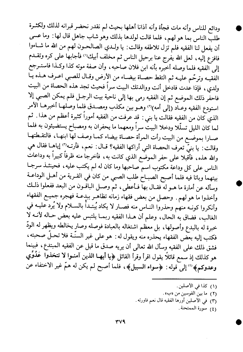 ودائع للنَّاس وَأَنه مَاتَ فَجْأَة وَأَنه آذَانا أَهلهَا بِحَيْثُ لم نقدر نحضر قبرانه لذَلِك ولكثرة طلب النَّاس بِمَا هُوَ لَهُم فَلَمَّا قَالَت لولدها بذلك وَهُوَ شَاب جَاهِل قَالَ لَهَا وَمَا عَسى أَن يفعل لنا الْفَقِيه فَلم تزل تلاطفه وَقَالَت يَا وَلَدي الصالحون لَهُم من الله مَا شَاءُوا فافزع إِلَيْهِ لَعَلَّ الله يفرج عَنَّا برحيل النَّاس ثمَّ مخلف أَبِيك فأجابها على كره وَتقدم إِلَى الْفَقِيه فَلَمَّا وَصله أخبرهُ بِأَنَّهُ ابْن فلَان صَاحبه وَأَن صفة مَوته كَذَا وَكَذَا فَاسْتَرْجع الْفَقِيه وترحم عَلَيْهِ ثمَّ الْتقط حَصَاة بَيْضَاء من الأَرْض وَقَالَ للصَّبِيّ اعرف هَذِه يَا وَلَدي فَإِذا عدت فَادْخُلْ أَنْت ووالدتك الْبَيْت سرا فَحَيْثُ تَجِد هَذِه الْحَصَاة من الْبَيْت فاحفر ذَلِك الْموضع ثمَّ إِن الْفَقِيه رمى بهَا إِلَى نَاحيَة بَيت الرجل فَلم يُمكن الصَّبِي إِلَّا استودع الْفَقِيه وَعَاد إِلَى أمه وَهُوَ بَين مكذب ومصدق فَلَمَّا وَصلهَا أخْبرهَا الْأَمر الَّذِي كَانَ من الْفَقِيه فَقَالَت يَا بني قد عرفت من الْفَقِيه أمورا كَثِيرَة أعظم من هَذَا